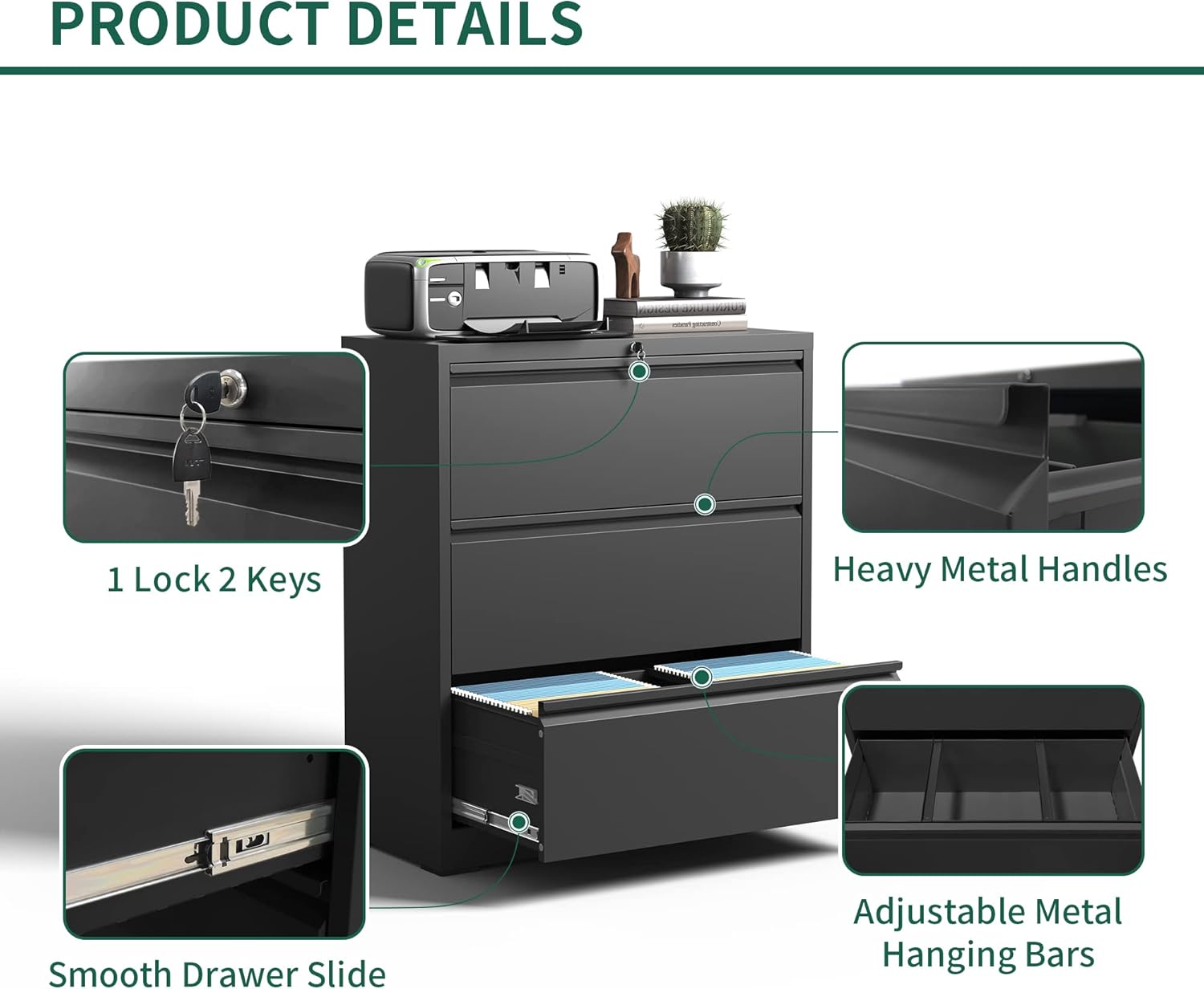 - 【Humanized Design】: The steel ball bearing full extension drawer of the lateral file cabinet slide, high-quality ball bearing glides for easy to open and close the drawers. Experience ultimate convenience with our filing cabinet's humanized design features, allowing you to work without disturbing others and maintaining a peaceful environment.