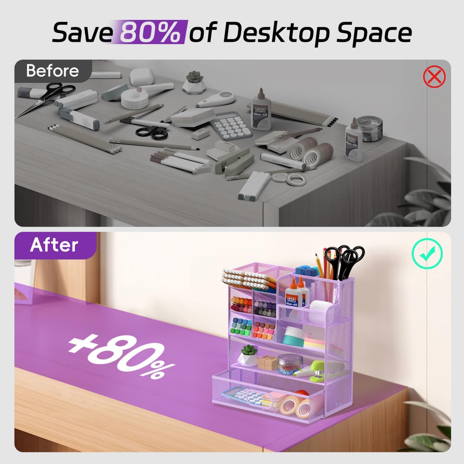 Mesh Pen Organizer for Desk, Multi-Functional Pencil Holder with Drawer Desk Organizers, Large Capacity Storage for School Office Home Supplies (Purple)