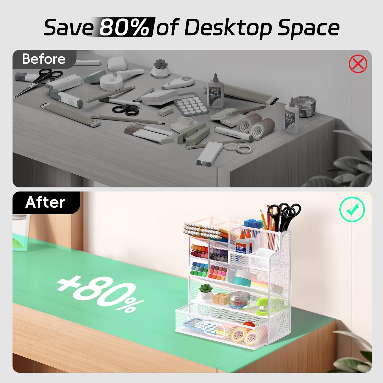 Mesh Pen Organizer for Desk, Multi-Functional Pencil Holder with Drawer Desk Organizers, Large Capacity Storage for School Office Home Supplies (White)