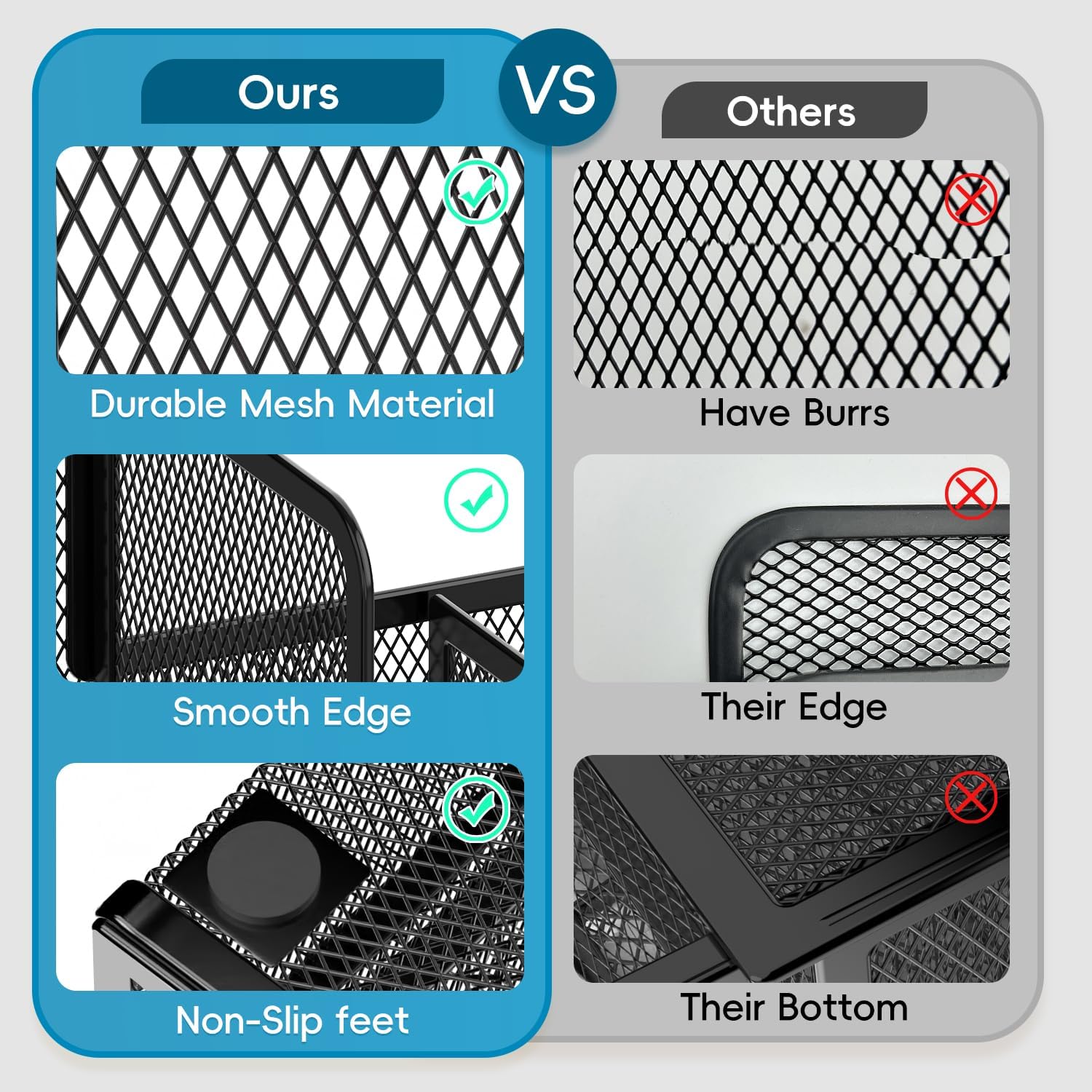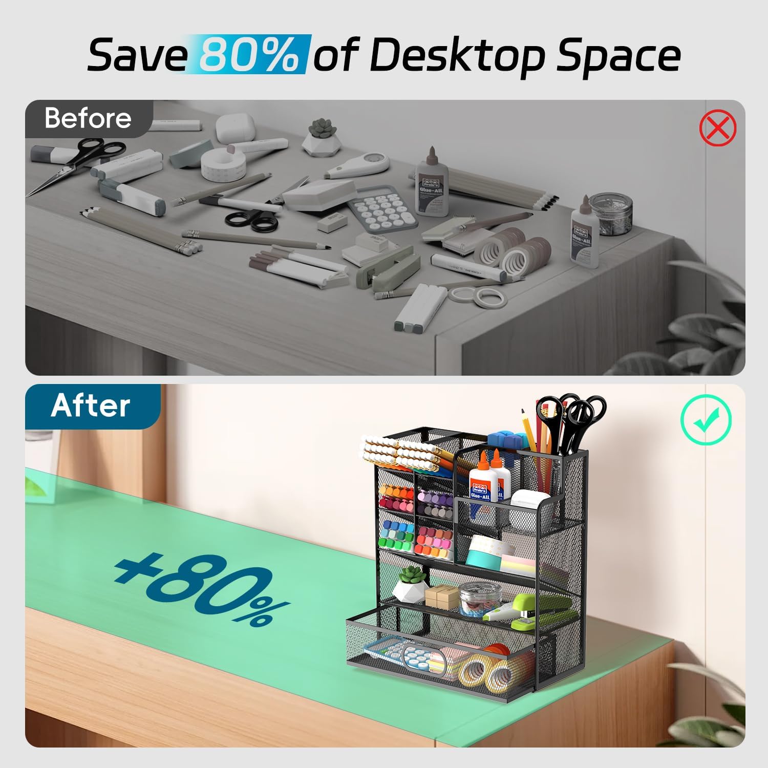 Mesh Pen Organizer for Desk, Multi-Functional Pencil Holder with Drawer Desk Organizers, Large Capacity Storage for School Office Home Supplies (Black)