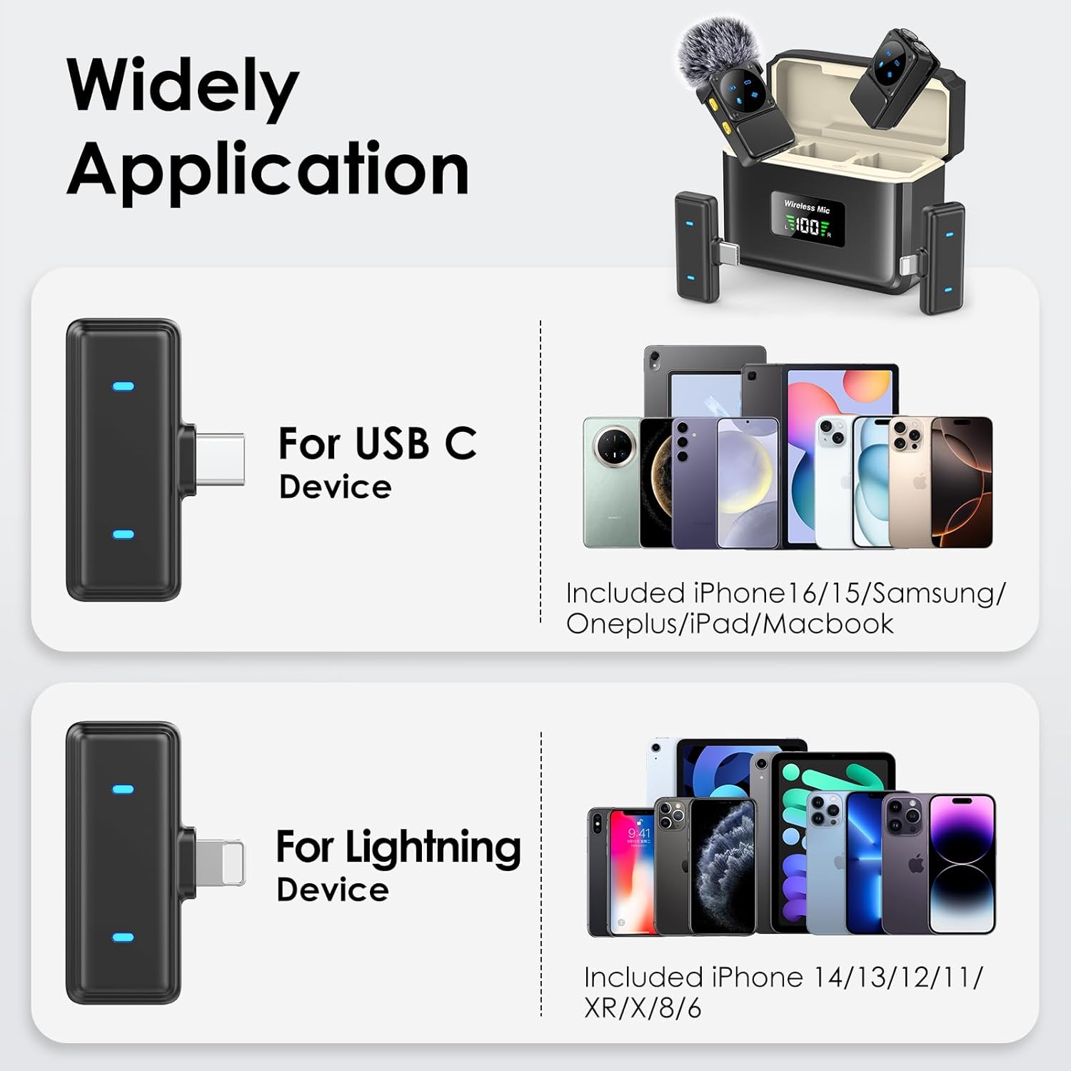 - [Supports USB C and iOS] With lightning and C connectors, this bluetooth microphone supports all USB C and lightning port devices, such as iOS (iPhone 15-16/ 15-16 Pro/ Pro Max, etc) and almost all Android Phones(Samsung, Google Pixel) and tablets. (Note: Please turn on the "OTG" function of your USB C device before pairing)