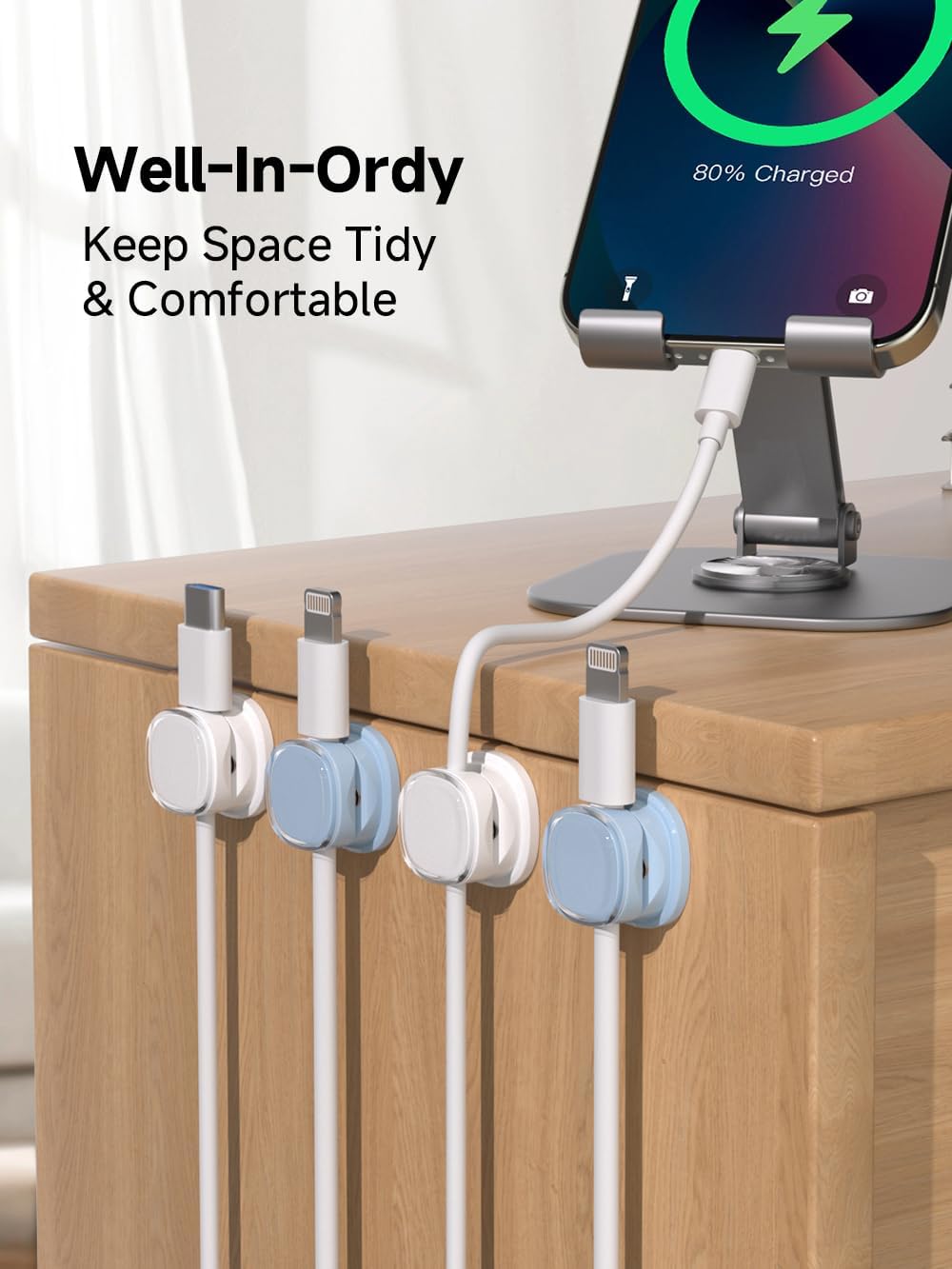Magnetic Cable Clips, Adjustable Cord Holder Management, Adhesive Wire Keeper Organizer for Home Office Desk Phone PC Car Wall Desktop Nightstand Appliance (9-PCS White & Blue)
