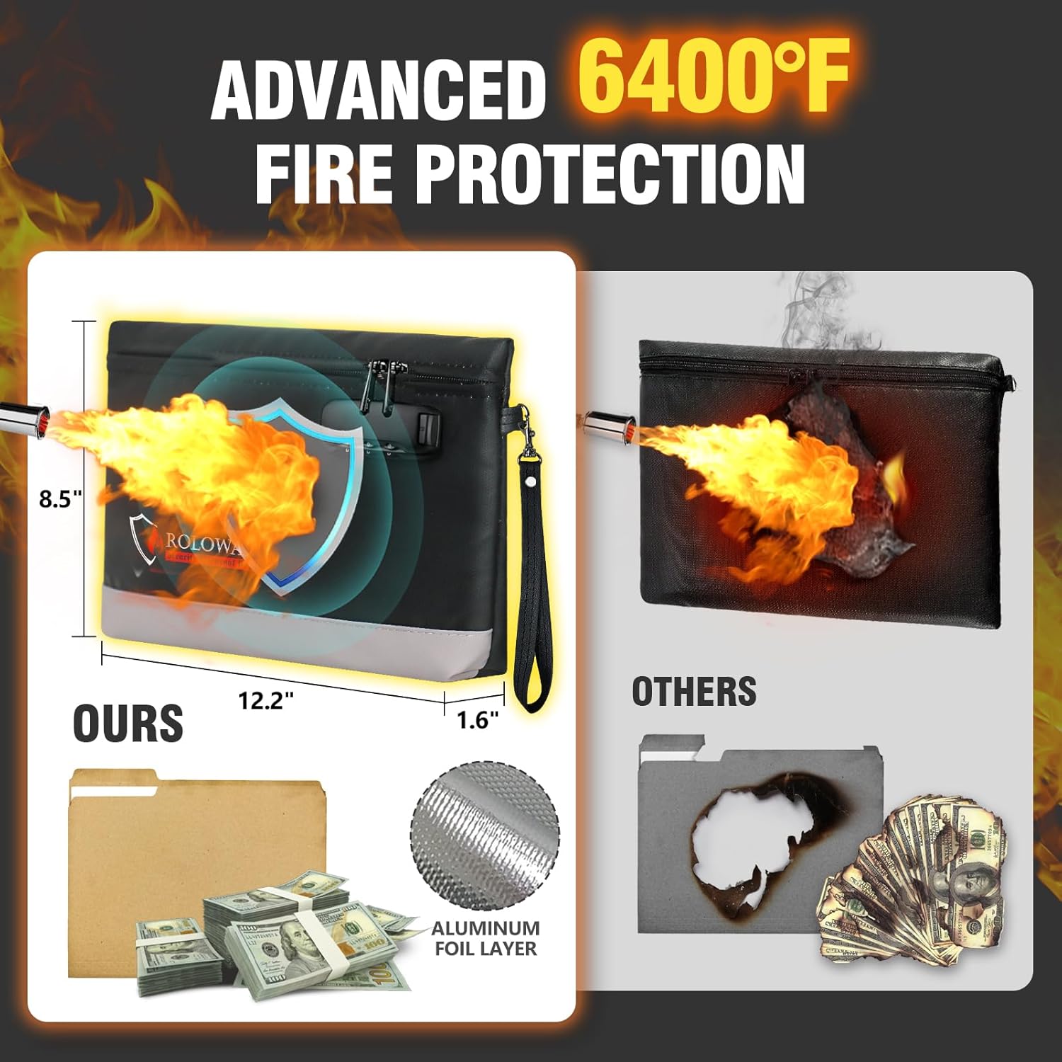- [ALL SEALED UP 6400°F FIRE & WATER RESISTANT BAG]: Protect your valuables with confidence. This fireproof money bag features a 12-LAYER STRUCTURE that can withstand temperatures up to 6400°F (UL94 VTM-0) in certain times. It's your go-to fireproof document bag for cash, IDs, passports, valuables and more—offering peace of mind during emergencies.