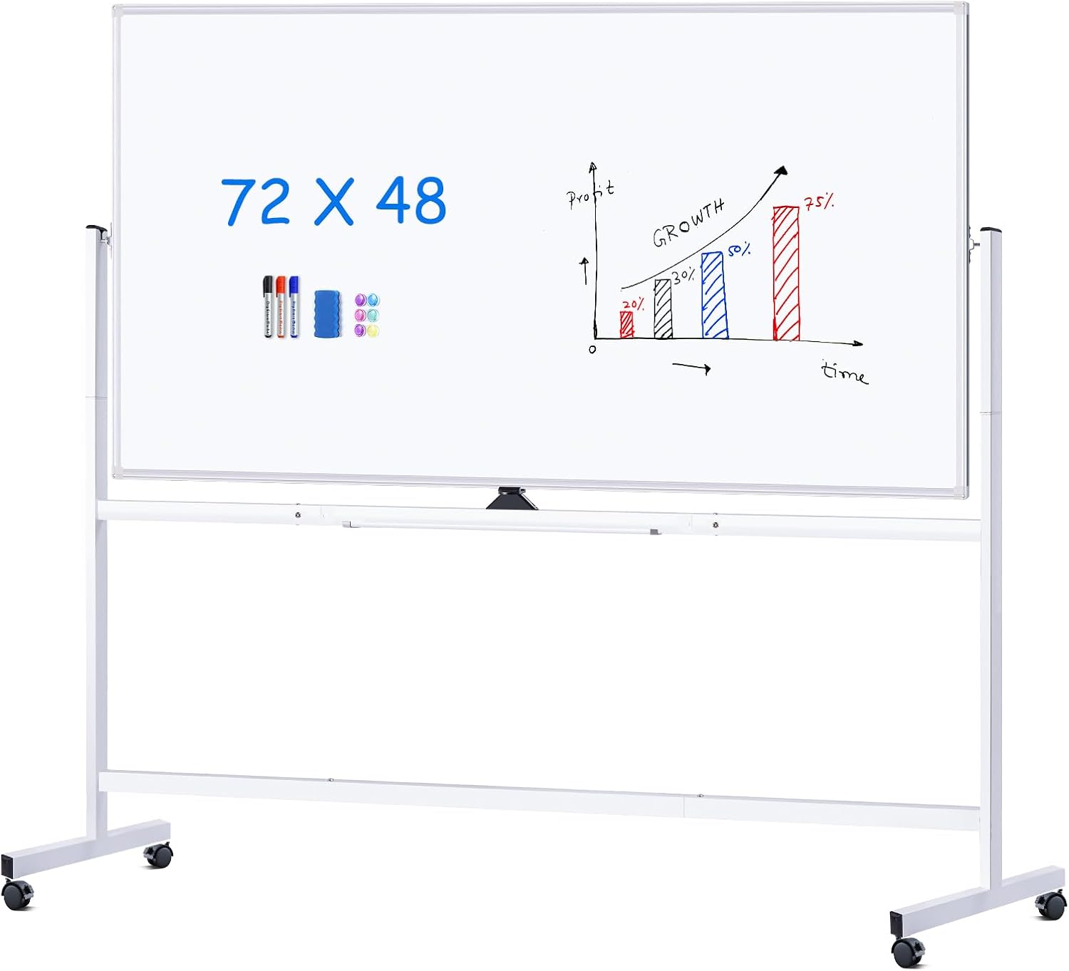 - Large Space for Writing: 72 x 48 inches whiteboard on wheels offers plenty of space for displaying ideas, teaching lessons, or making presentations at work. Even two people can work together concurrently with the large double-sided whiteboard. Each white board on wheels has a length of 48 inches marker tray, offering plenty of room to keep your writing supplies organized and close at hand. Get a much more comfortable writing and wiping experience with maxtek rolling white board