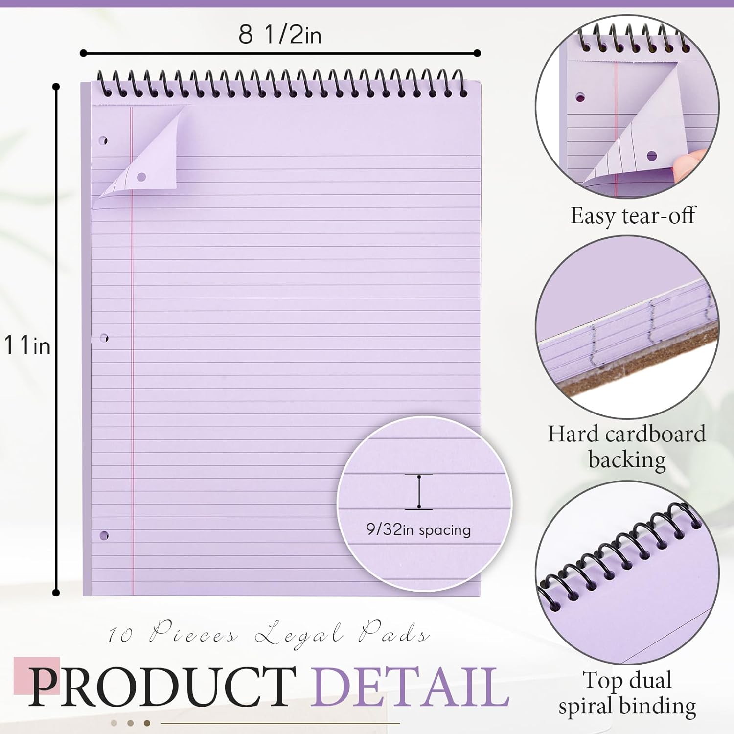 10 Packs 8.5" x 11" Top Spiral Notebook with 3 Hole Punched Legal Pads College Ruled Notepad 50 Sheets Hard Cardboard Paper Wirebound Notepad for Office School Business (Green,Blue,Purple)