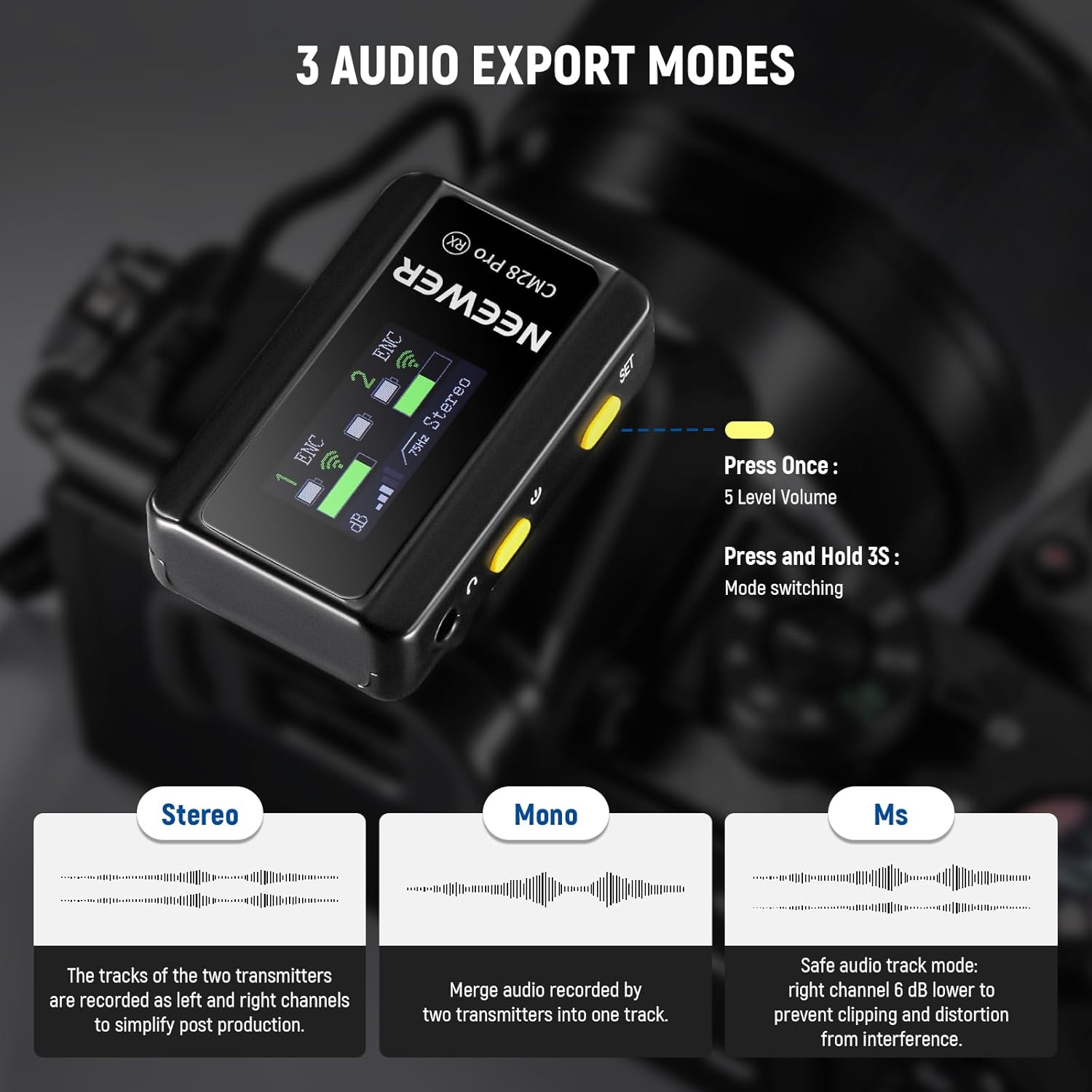 - 【4GB Storage Standalone Recording】 Each transmitter of this microphone set with 4GB storage doubles as a recording pen to save up to 9 hours of uncompressed 48KHz WAV audio files (up to 30min each) and supports dB gain control with a tap. Low frequency cut ensures accurate and warm voice recording. An LCD screen displays export modes, volume, battery levels, connection status, noise cancellation, and other info. Three audio export modes: Mono, Stereo, and Ms