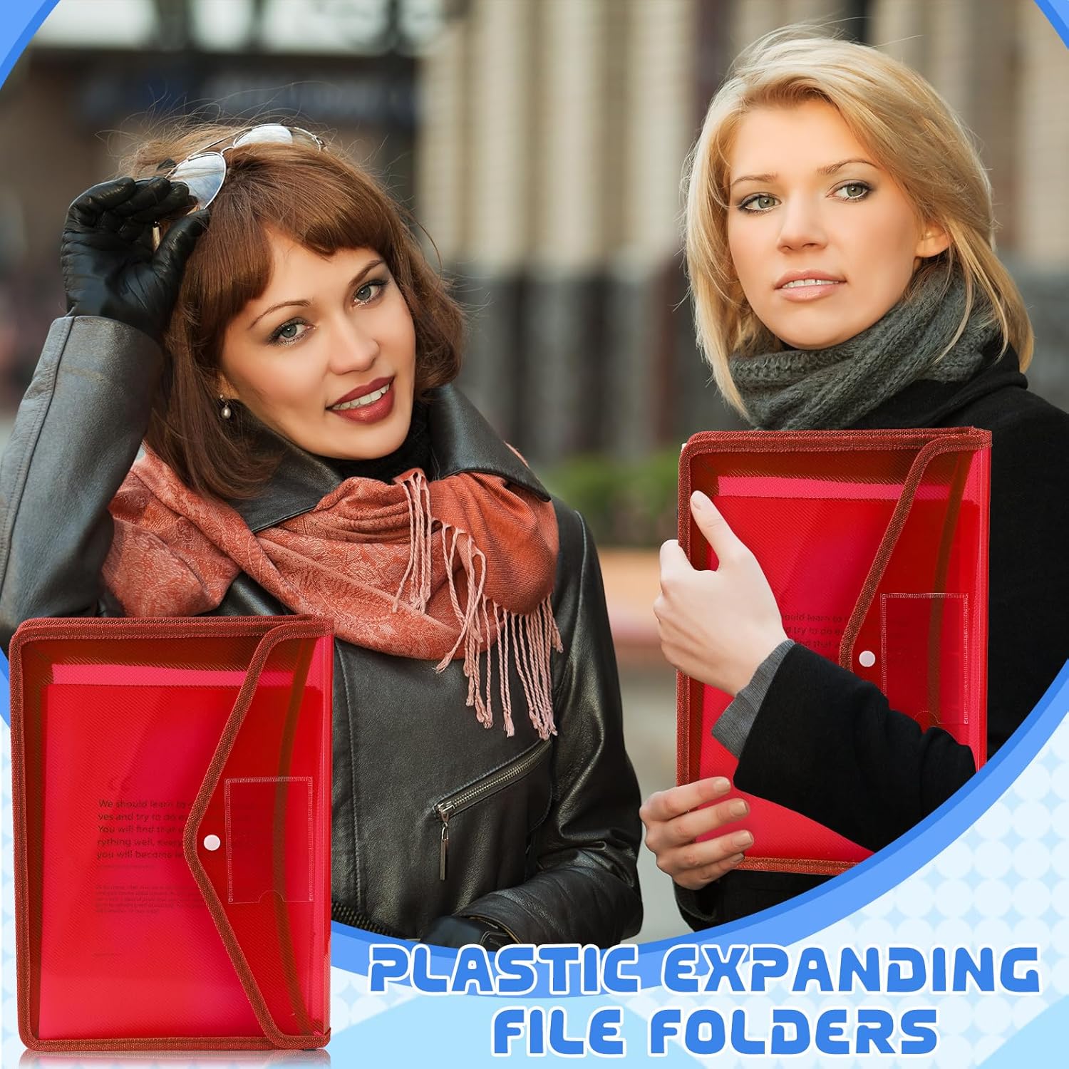 4 Pack A4 Expanding Plastic File Folders Waterproof Document Organizer with Snap Button Multiple Pockets, Office Home Office Storage (Red)