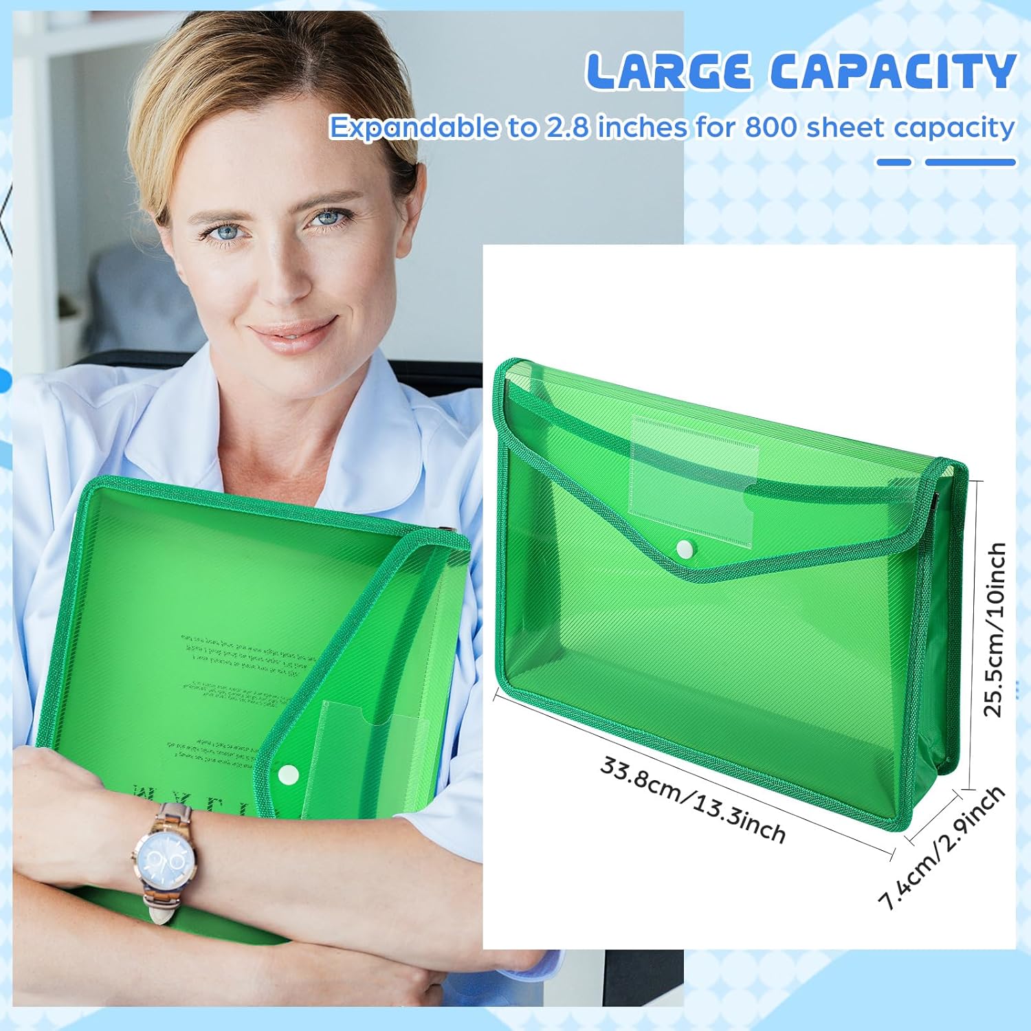 4 Pack A4 Expanding Plastic File Folders Waterproof Document Organizer with Snap Button Multiple Pockets, Office Home Office Storage (Green)