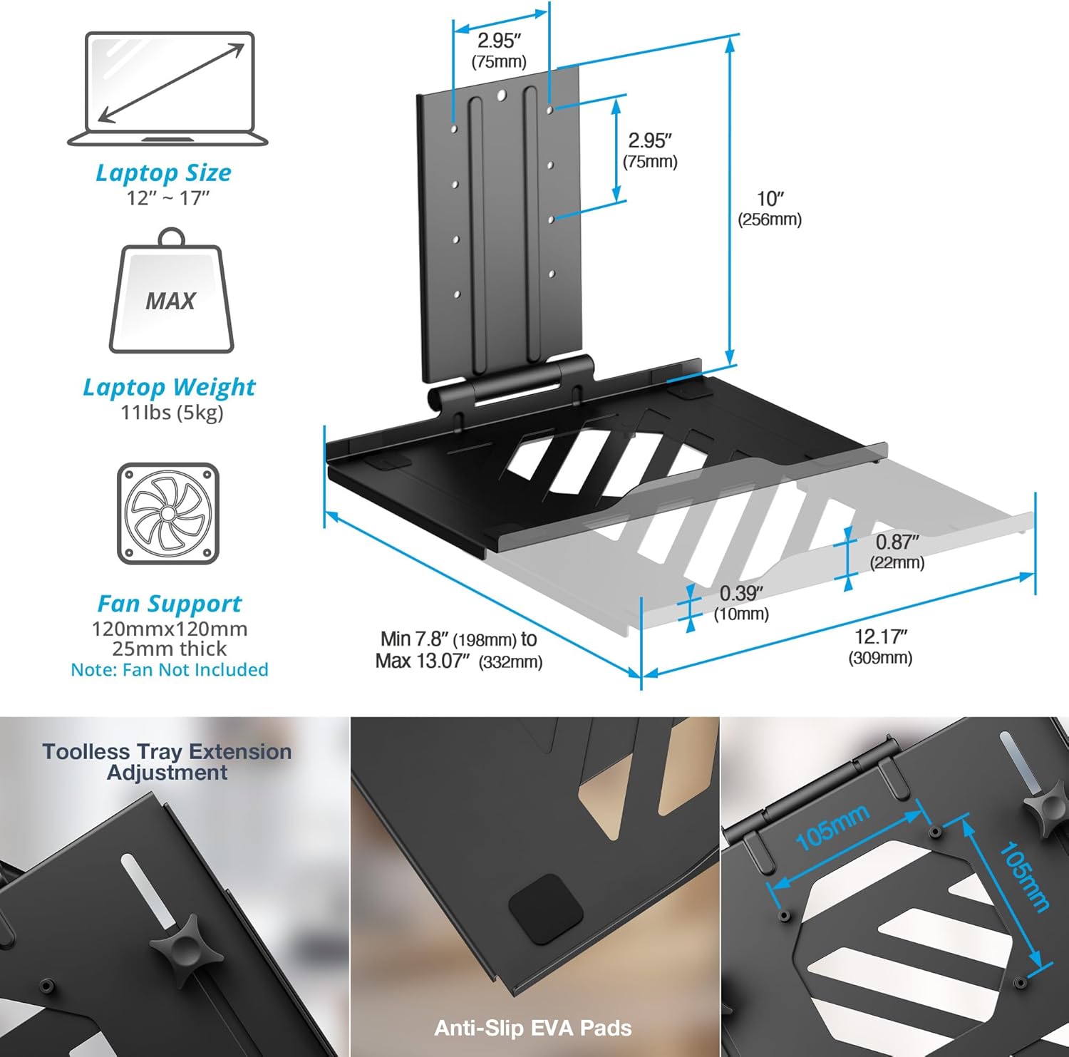 - Laptop Cooling Tray Included: Adjustable 12"-17" laptop tray with ventilated mesh and fan-ready design ensures optimal performance and airflow. NOTE: fan not included.