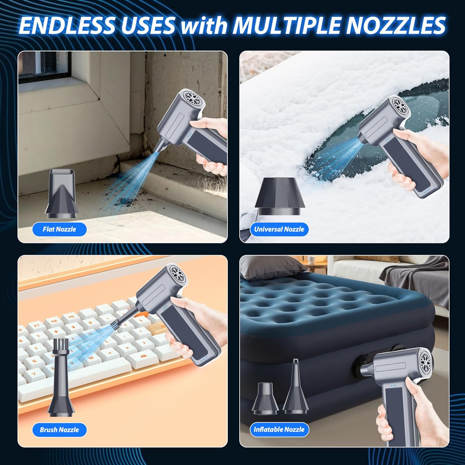 - Powerful Turbo Fan Performance: This compressed air features a brushless motor reaching 300,000 RPM with a max wind force of 200g, effortlessly blowing away dust and debris. As an eco-friendly electric air duster, it replaces disposable compressed air cans, making it ideal for heavy-duty cleaning tasks like blowing dust from pc/keyboard/toys/camera/ps5 ect, even removing snow from your car.