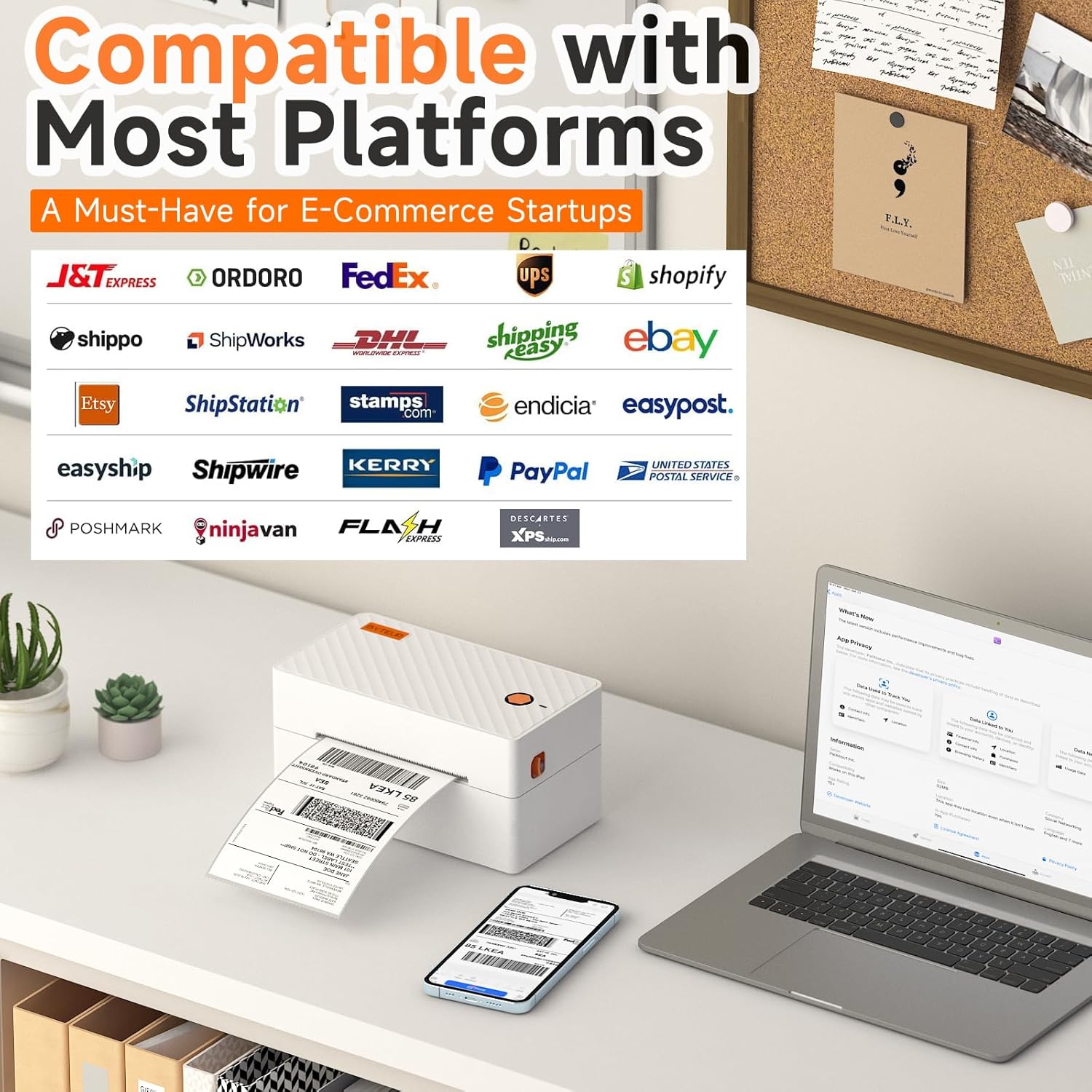- 【Works with Major Platforms & Labels】Ideal for e-commerce sellers, this printer supports all key marketplaces and carriers—including Amazon, eBay, UPS, FedEx, and Shopify. (Save files as PDFs from these platforms for smooth printing.) Accepts any brand of thermal label rolls ranging from 1.57" to 4.1" wide. Use the mobile app to easily create customized shipping labels, barcodes, thank-you notes, and more.
