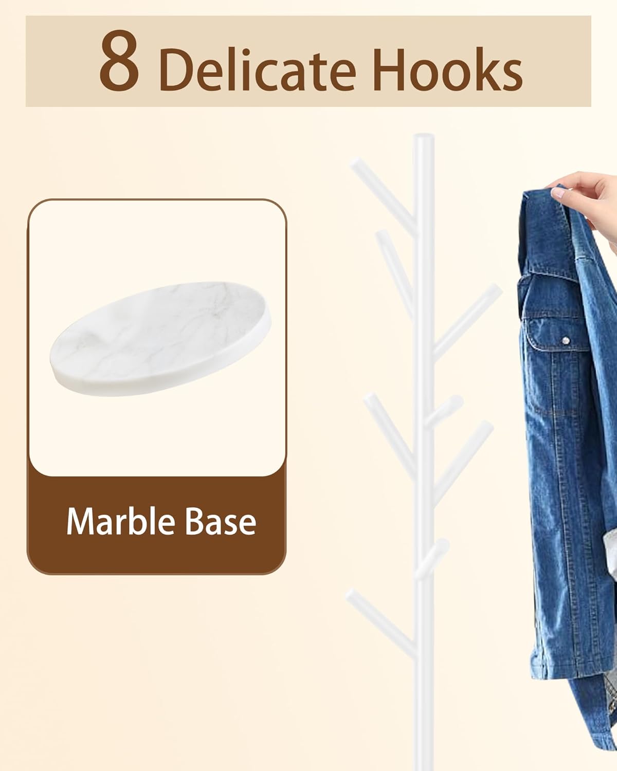 EZIVIEZ Modern Coat Rack Stand, Metal Freestanding Coat Rack with Natural Marble Base, White Coat Racks with 8 Hooks and Coat Hanger Tree Jacket Stand for Office, Entryway, Hallway