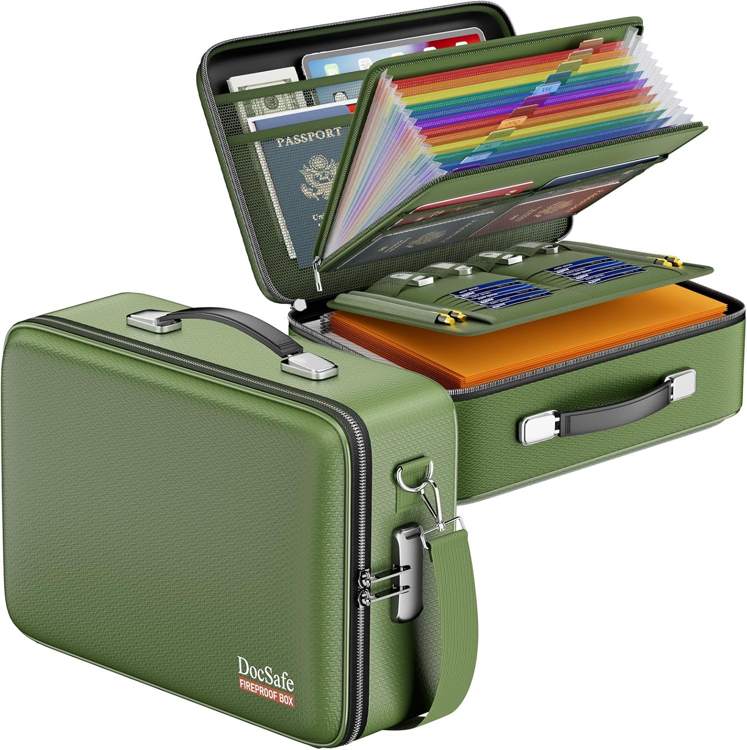DocSafe Fireproof Document Box with Lock, Hard Case File Organizer with Accordion File Folder, Fireproof Water Resistant Safe Box Home Office Travel Storage for Important Documents Laptop Green
