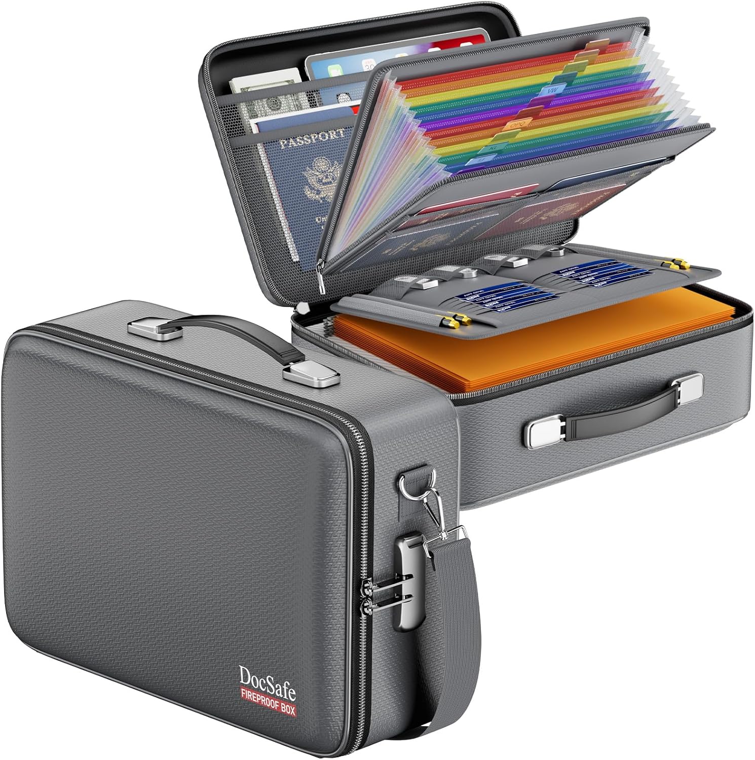 DocSafe Fireproof Document Box with Lock, Hard Case File Organizer with Accordion File Folder, Fireproof Water Resistant Safe Box Home Office Travel Storage for Important Documents Laptop Gray