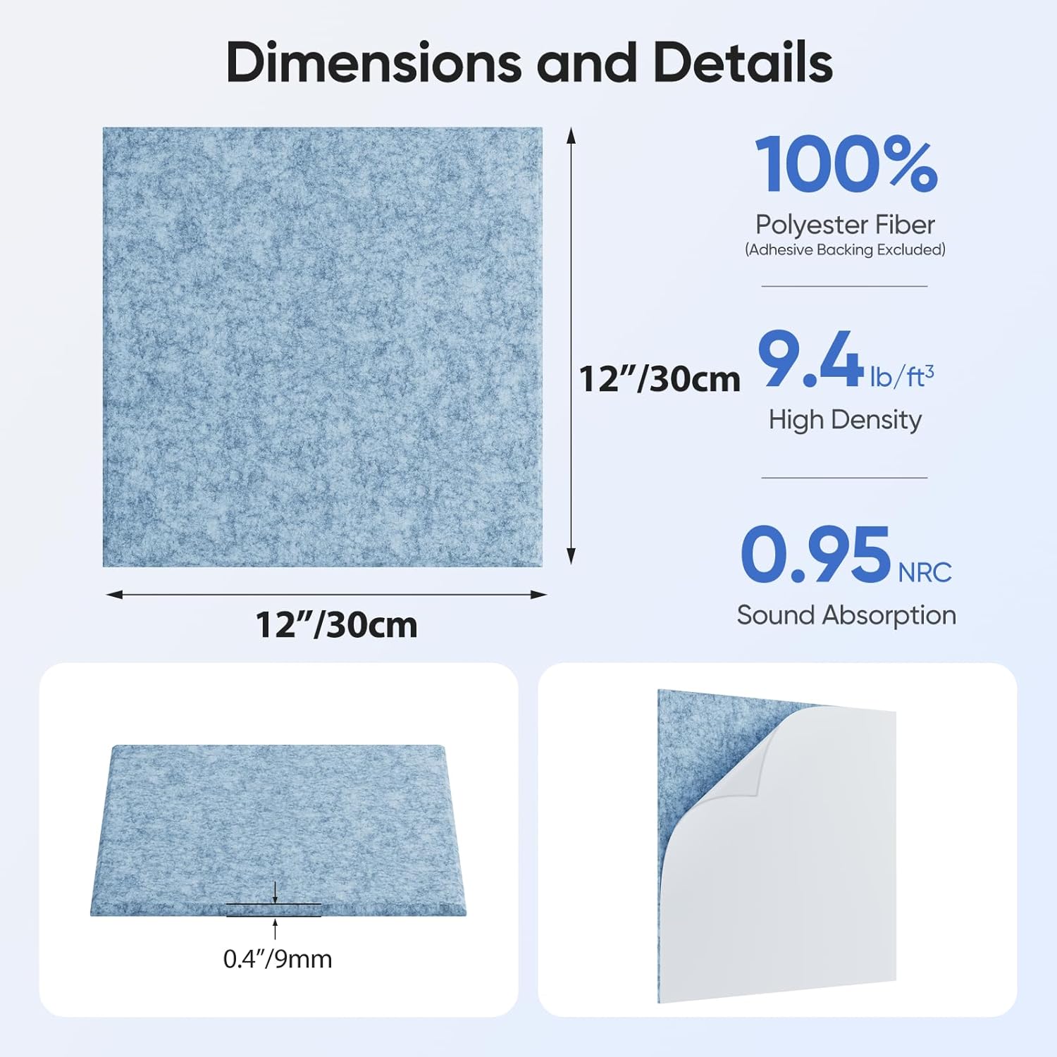 12 Pack 12" X 12" X 0.4" Acoustic Panels for Wall Sound Absorbing,Square Self-Adhesive Sound Panels, High Density Suitable for Multiple Scenarios(Light Sky Blue)