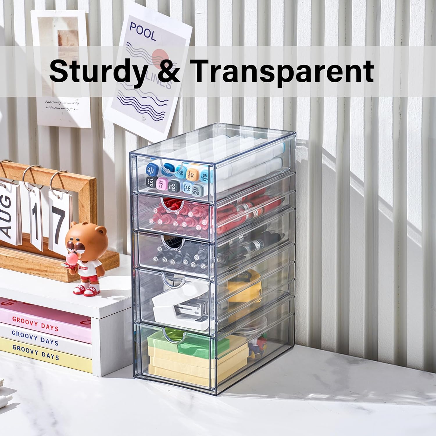 Prsildan Acrylic Drawer Makeup Organizer with 5 Drawers, Hair Accessories Organizer, Office Desk Organization, Clear Stackable Storage Drawers for Vanity, Countertop, Craft, Jewelry