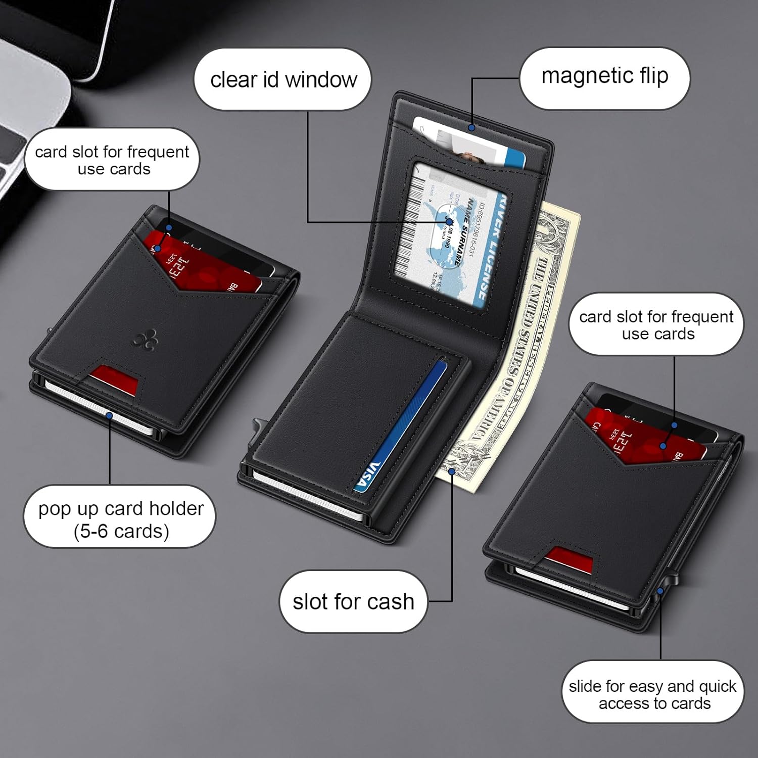 - QUICK & EASY CARD ACCESS: SEMORID slim wallet for men features a pop-up card holder design. With a simple press of the button on the side of the metal case, the cards pop out in a tiered layout, making it easy and quick to access them.