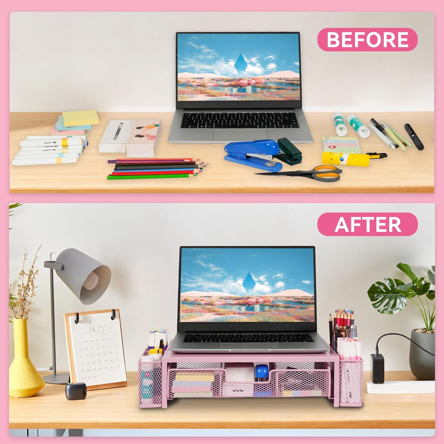 Computer Monitor Stand Riser with Drawer and Pen Holders, Desk Organizer Shelf and Accessories, Office Desk Accessories, Office Organization, Pink