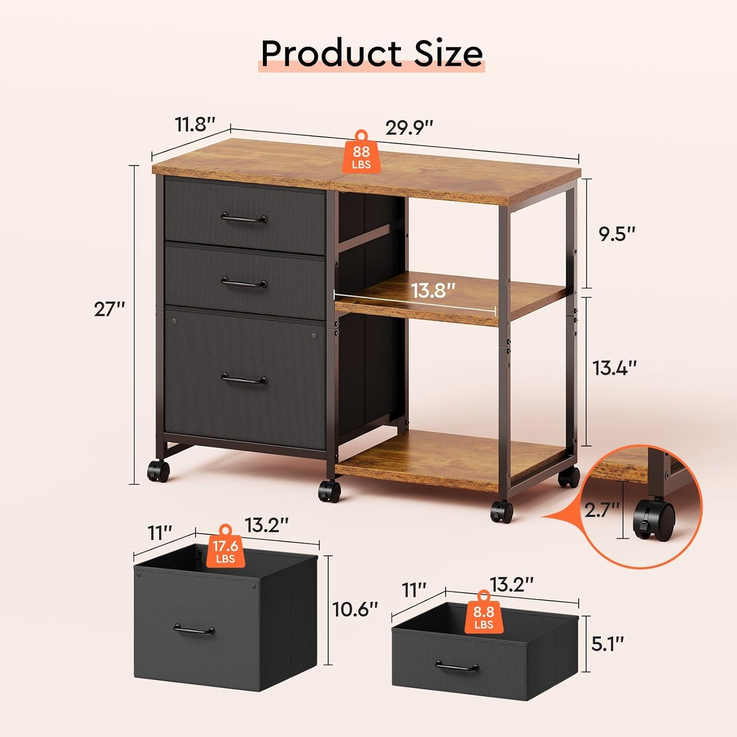3 Drawer File Cabinet with Wheels Rolling Printer Stand with Open Storage Shelf Fabric Lateral Filing Cabinet for Home Office,Rustic Brown
