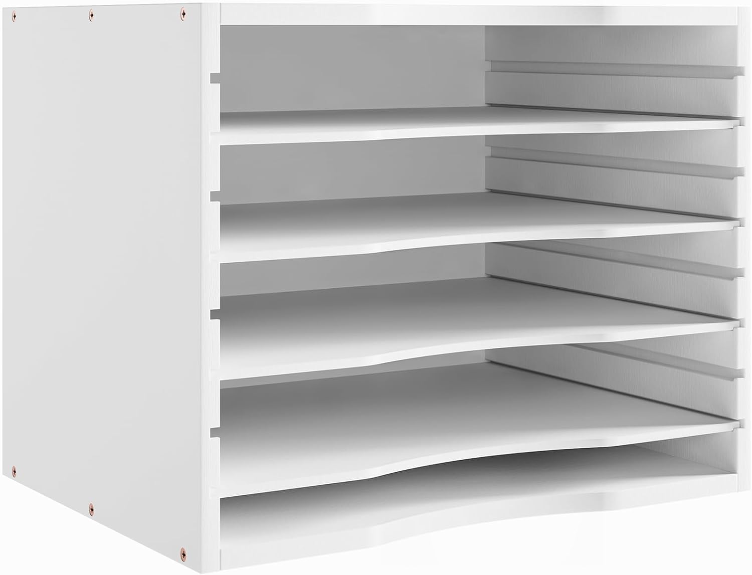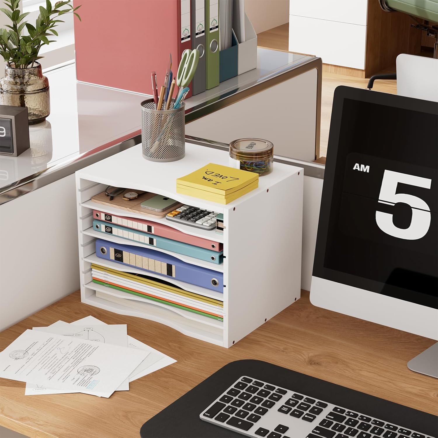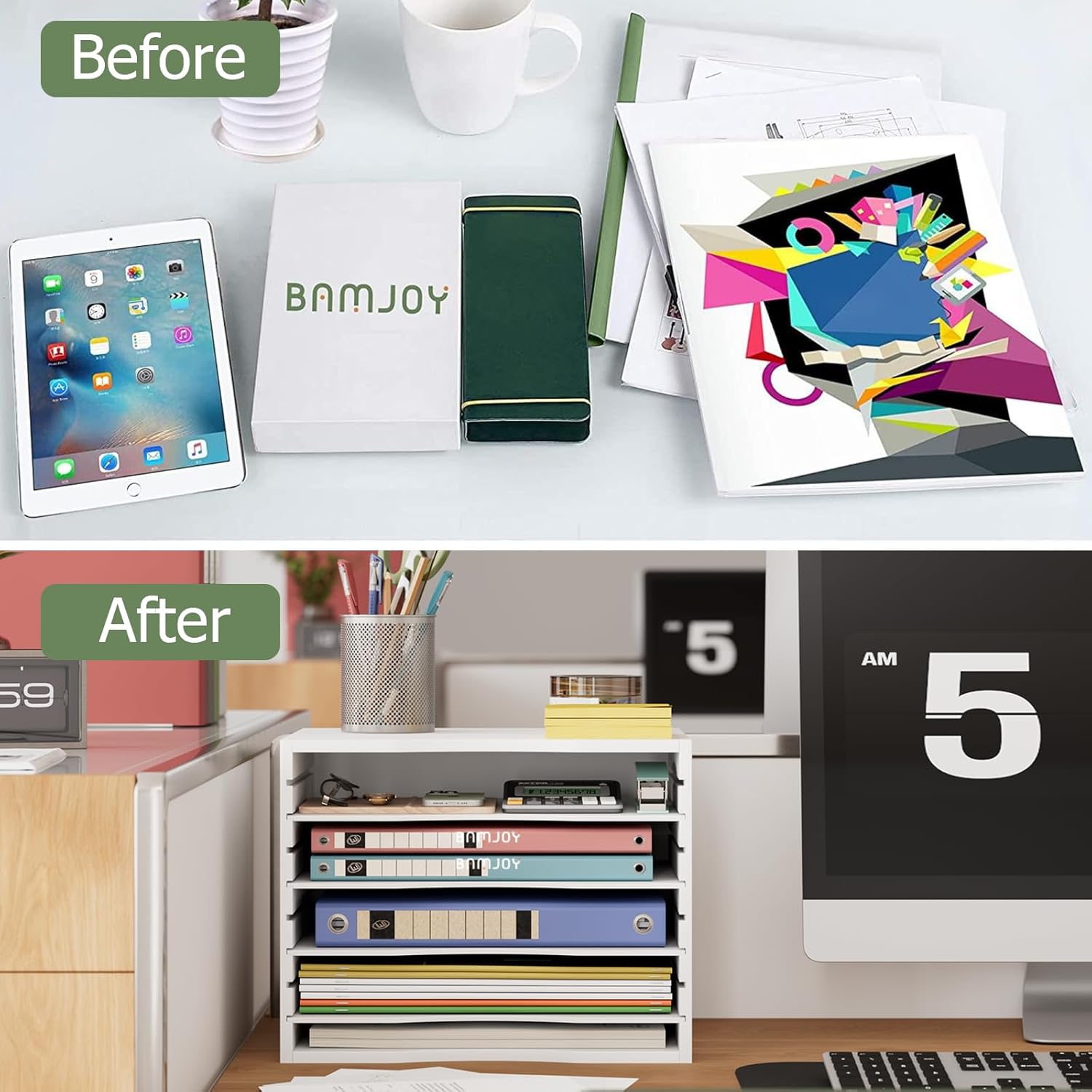 Bamjoy Bamboo 5 Tier Desktop Organizer, Paper Organizer Mail Sorter, File Holder Letter Document Storage with Adjustable Shelves for School Home Office, White