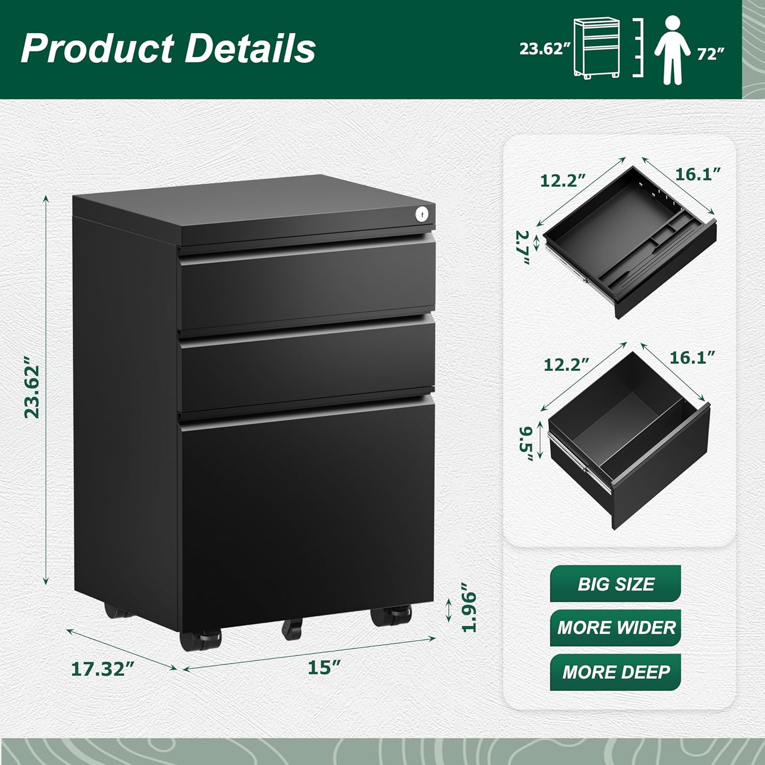 - ❤All for Improving Office Productivity -- Overall size:14.9" W×17.32"D×23.8"H, perfect size make the black file cabinet can be put under desk or side table or small spaces to save space, 5 smooth anti-tilt casters can be rotated 360°and locked, flexibly adapting to the all kinds of office floor. 1 stationery tray is included, you can use it to organize small office supplies. Unique pull-out handles are easy to grab. All for improving office productivity and efficiency!