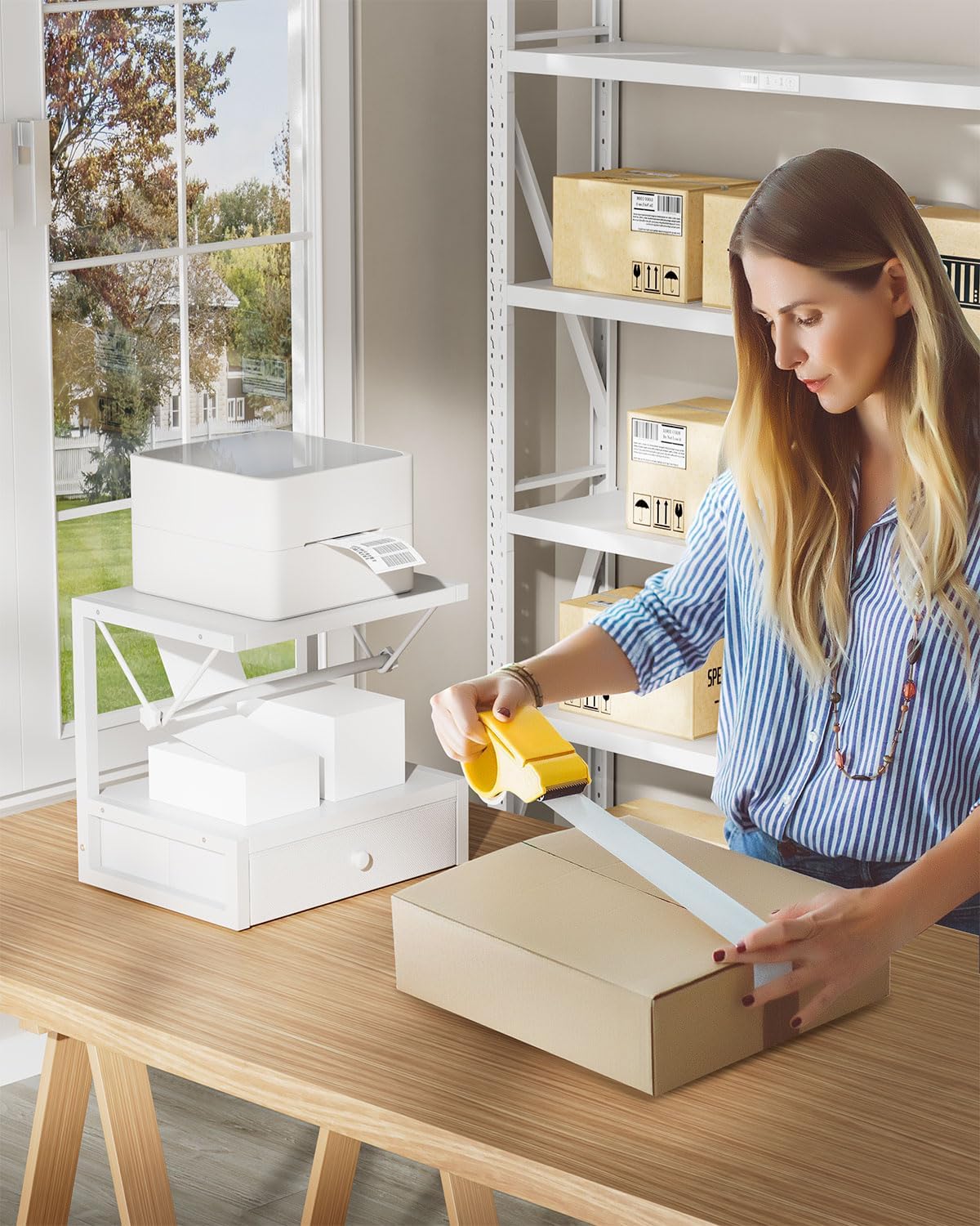- With drawers: the top stores the printer, and the bottom drawer stores label rolls and folded labels. It not only saves space, but also ensures that your tags are organized neatly and easily accessible.