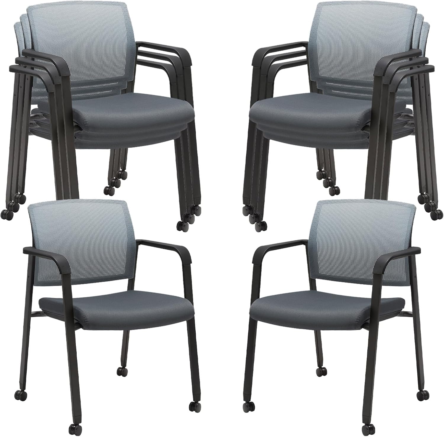 CLATINA Mesh Back Stacking Arm Chairs with Upholstered Fabric Seat and Ergonomic Lumbar Support for Office School Church Guest Reception (WithWheels Gray- 8 Pack)
