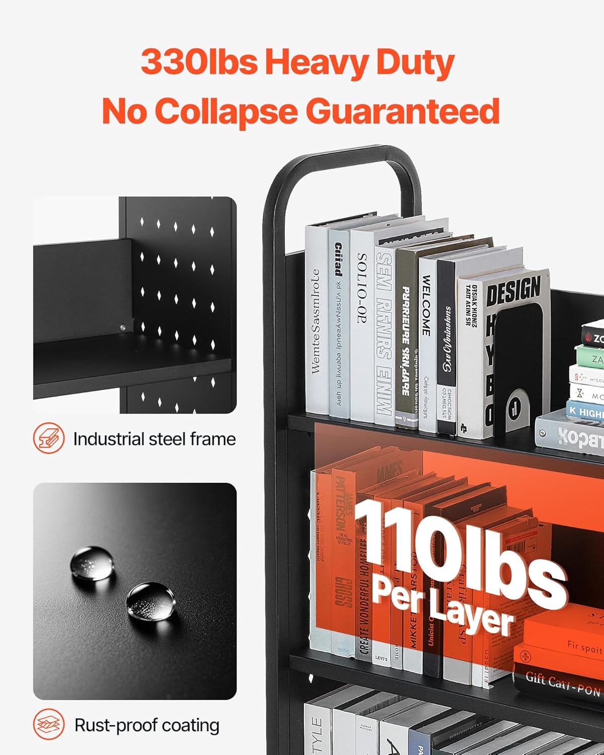 - Stable Load-bearing: Made of high-strength carbon steel, each layer of the rolling book cart supports 110 lbs (50 kg), with a total capacity of 330 lbs (150 kg). The rust-resistant coating ensures durability, ideal for heavy books or equipment