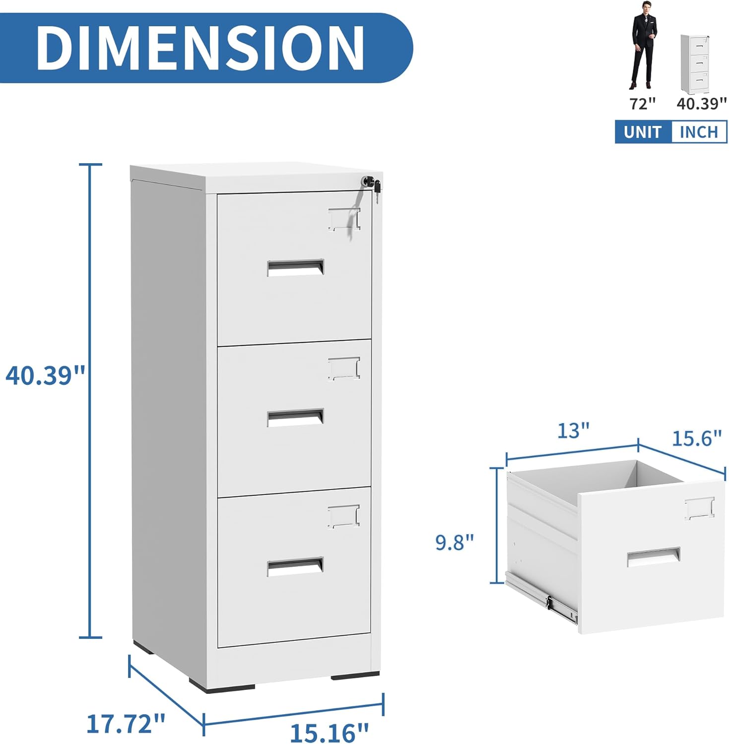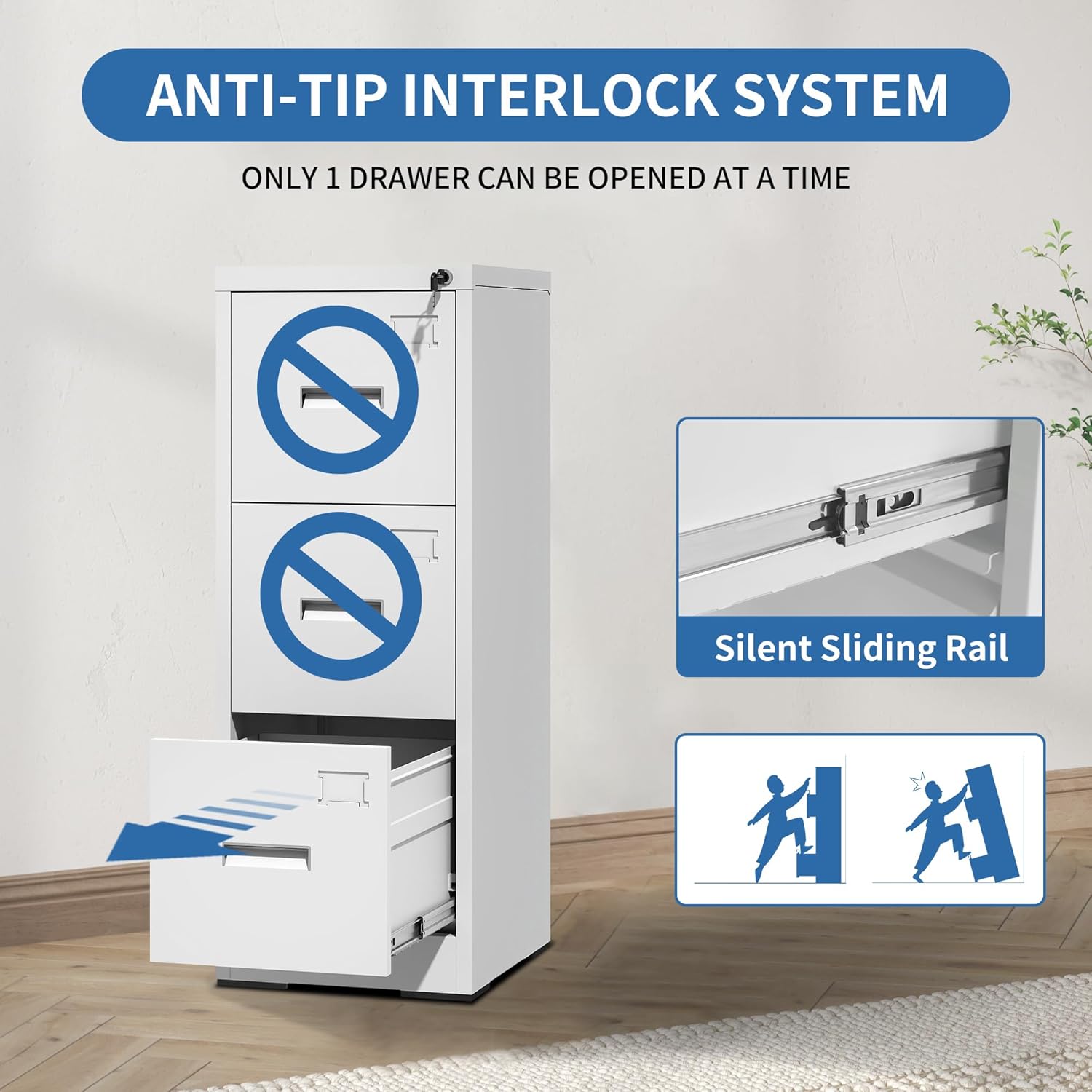 - 【Secure & Anti-tilt Design】Our office filing cabinets with 3 drawer feature a locking mechanism and anti-tip feature. When one drawer is opened, the interlocking drawer system prevents the other drawers from opening, preventing tip-overs and increasing safety.