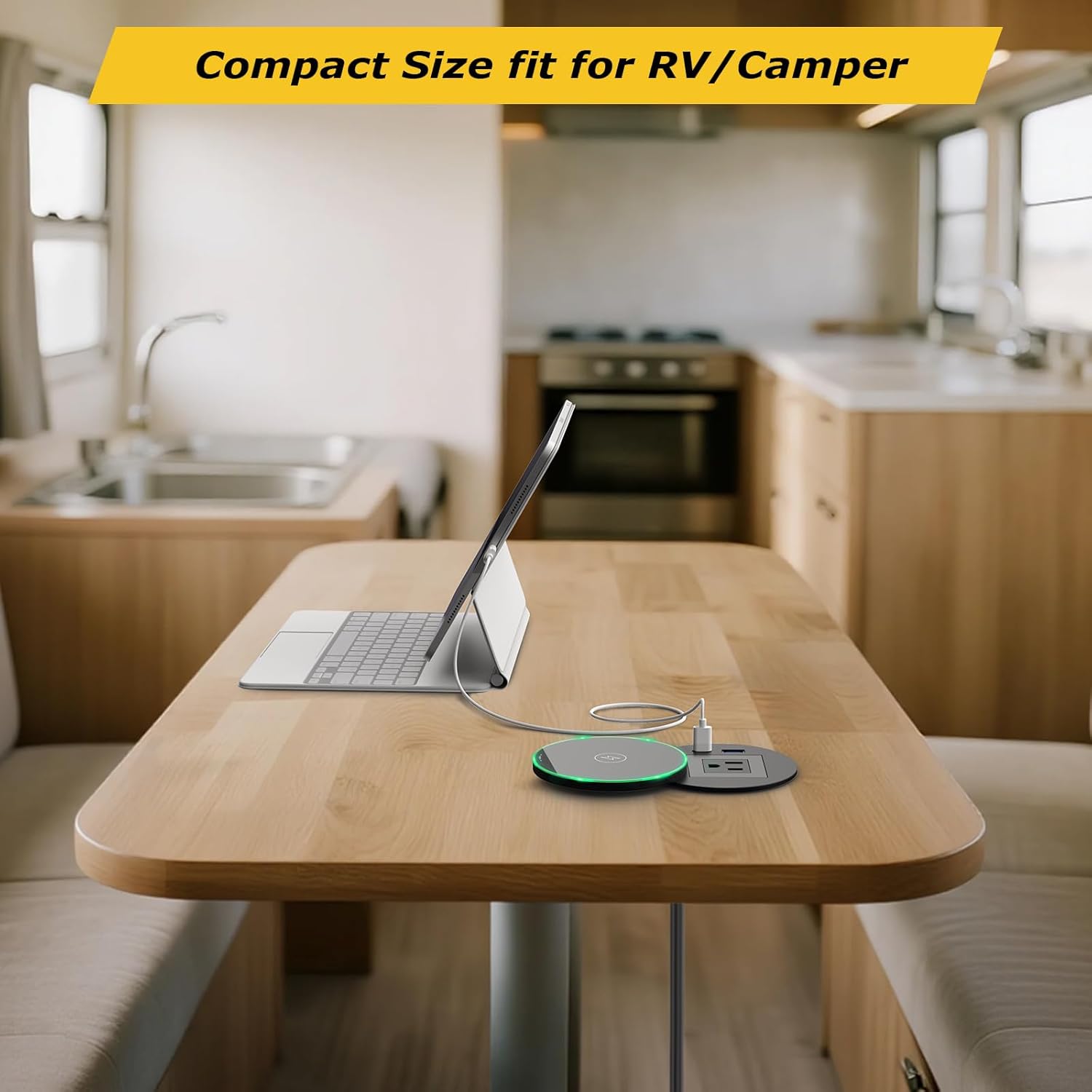 Desk Power Grommet with PD 30W USB C, 15W Wireless Recessed Power Outlets with 1 AC Plugs and 2 USB Ports, Hidden Power Strip for Office Kitchen Cabinet Conference Room