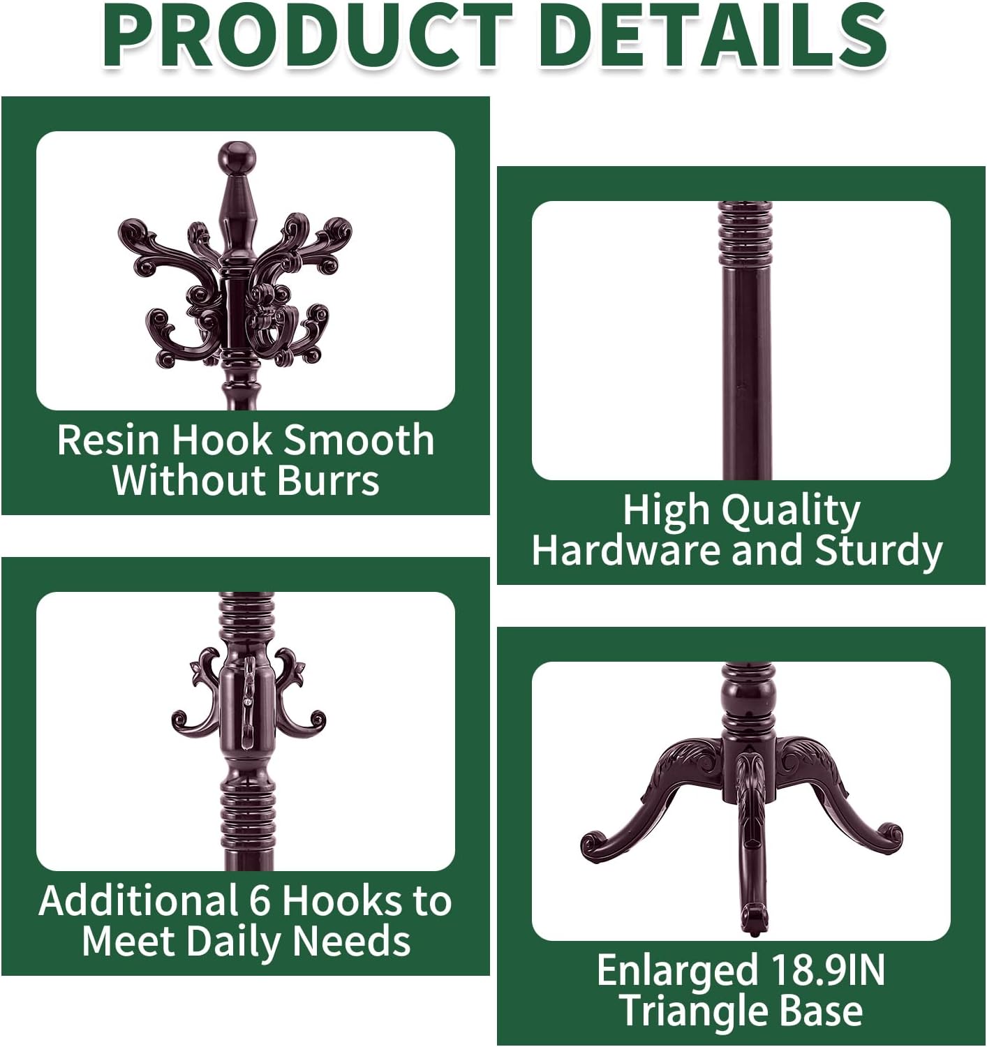 - STURDY AND STABLE STRUCTURE: The chassis of the wooden coat rack adopts a high quality resin and enlarged triangle base, which is stable and does not shake. The main pole diameter of 3.54inch, which is thick and sturdy and can bear 300 LBS