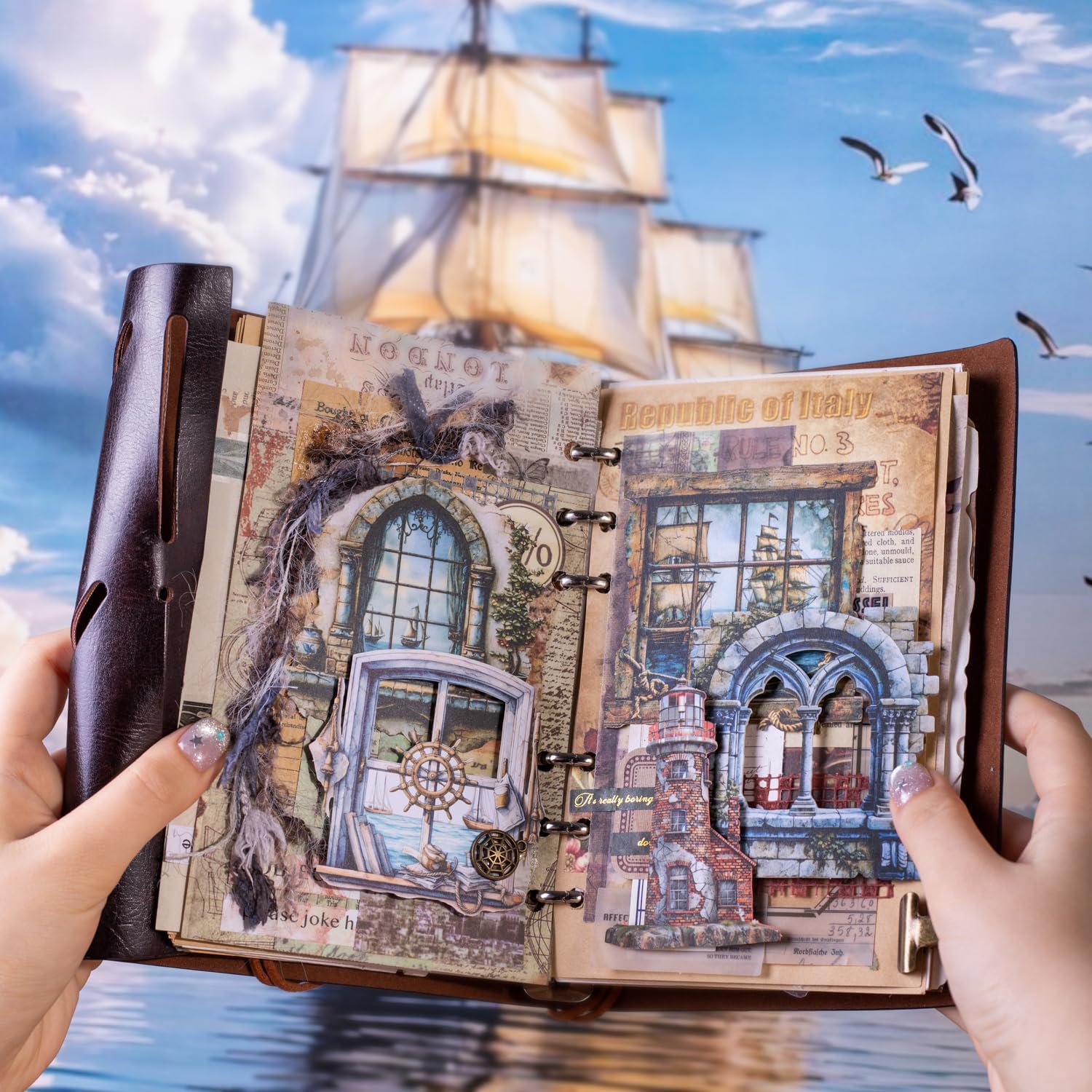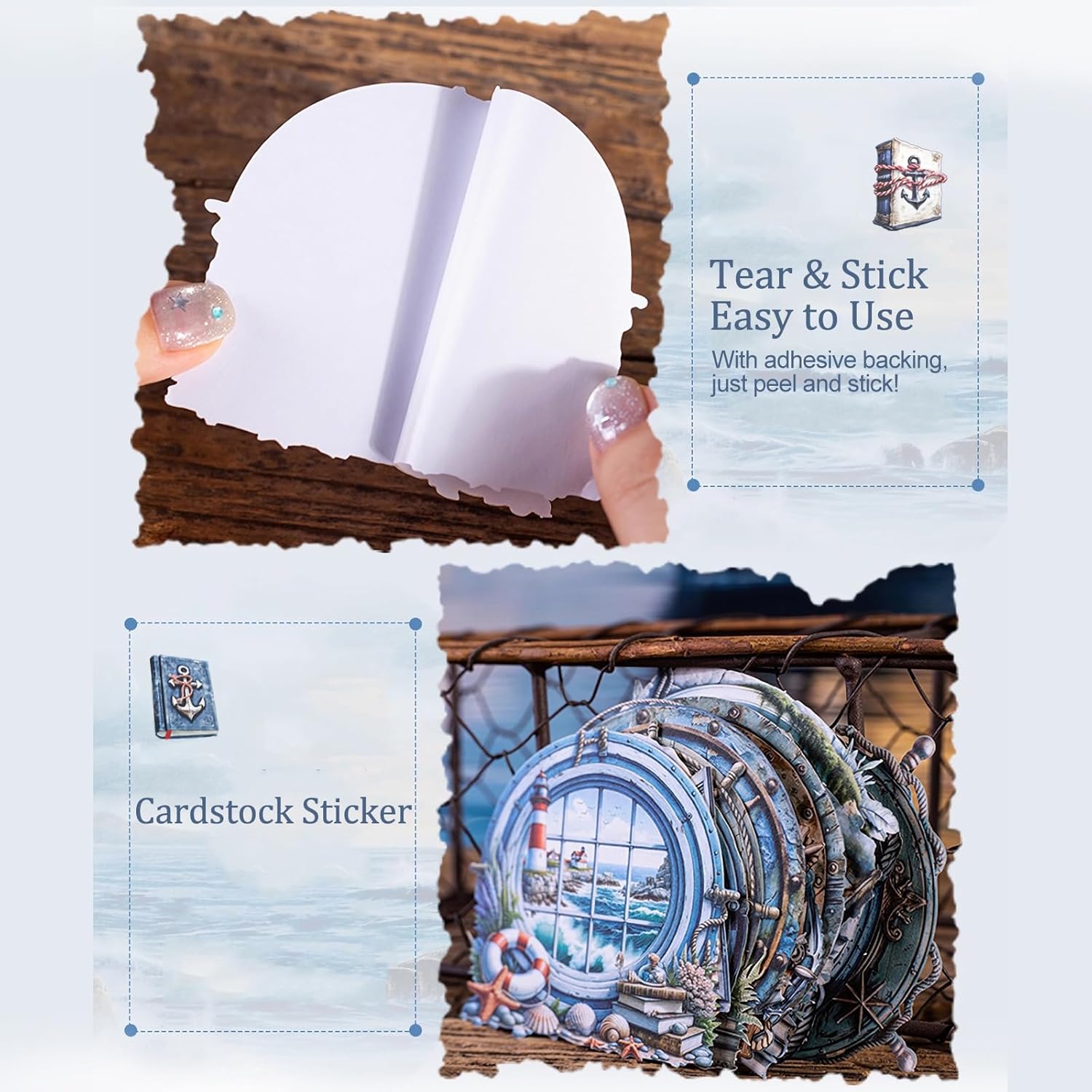 - Nautical Vintage Style: This 60-piece set features 6 themed designs with maritime motifs like ship wheels, anchors, windows, and lighthouses to bring layered charm to journals and scrapbooks