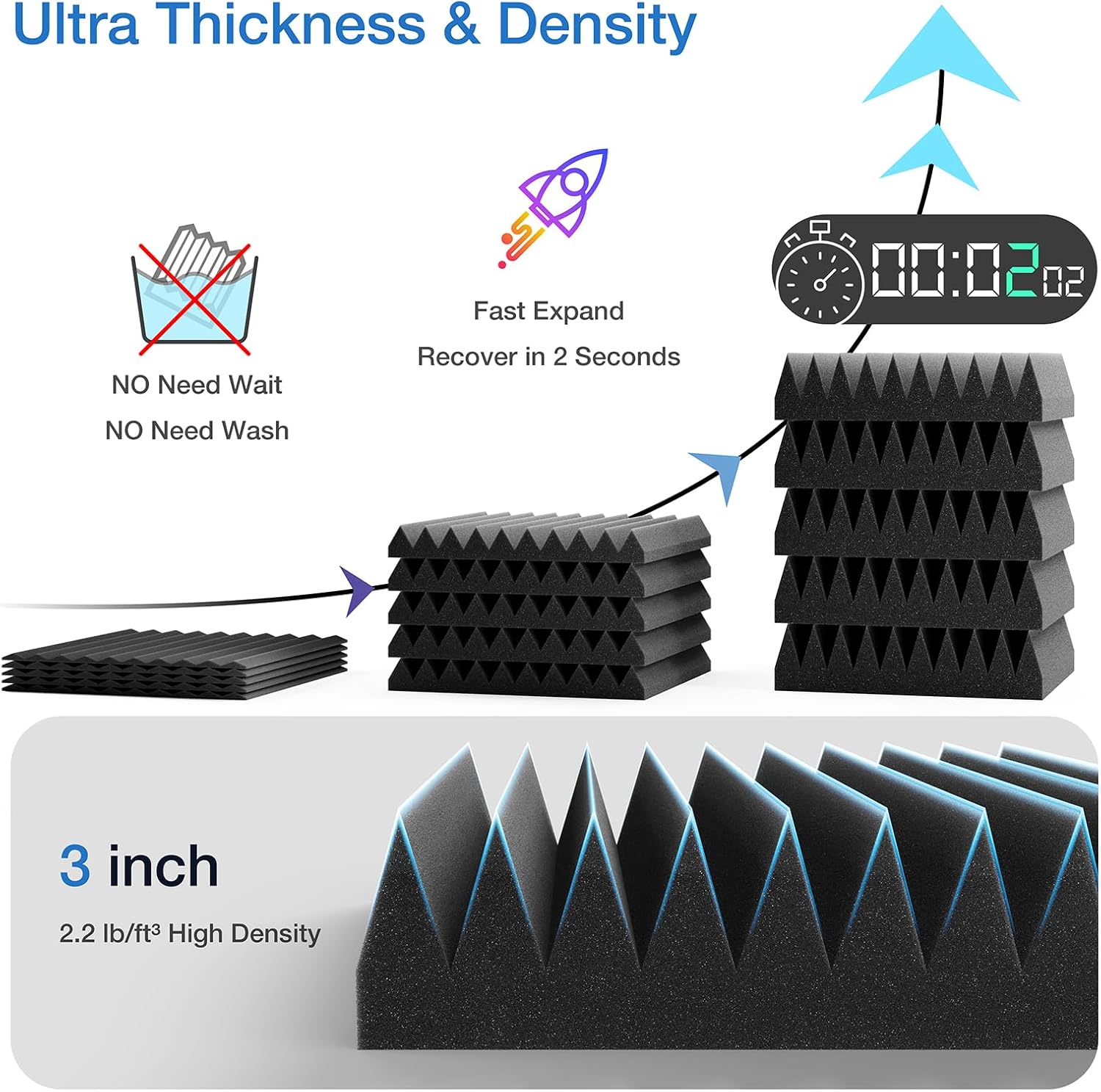 - 【High Density and Fast Recovery】Our 3 inch acoustic foam boasts an ultra-high density of 2.2 lb/ft³, delivering superior soundproof performance and exceptional elasticity. The sound proof foam panels for walls expands to its full thickness within seconds after unboxing