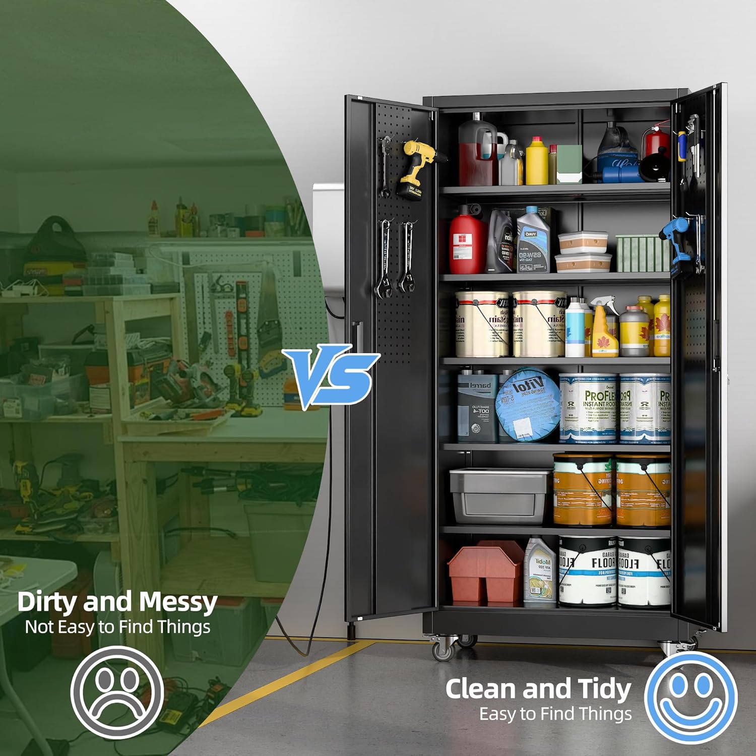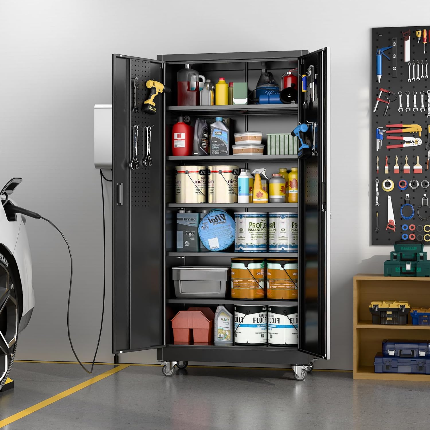 Aobabo Upgraded Garage Storage Cabinets with Wheels,Metal Storage Cabinets with 5 Adjustable Shelves for Garage Home Office Storage, Black,71''H*34''W*18''D,Assembly Required