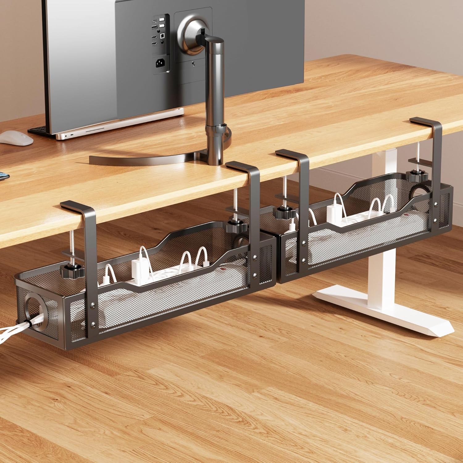 [Upgraded] 2 Pack Under Desk Cable Management Tray, Cinati Cord Organizers for Table Thickness up to 3", 16" Wire Organization with Clamp No Drill, Cable Management Box for Office - No Damage to Desk