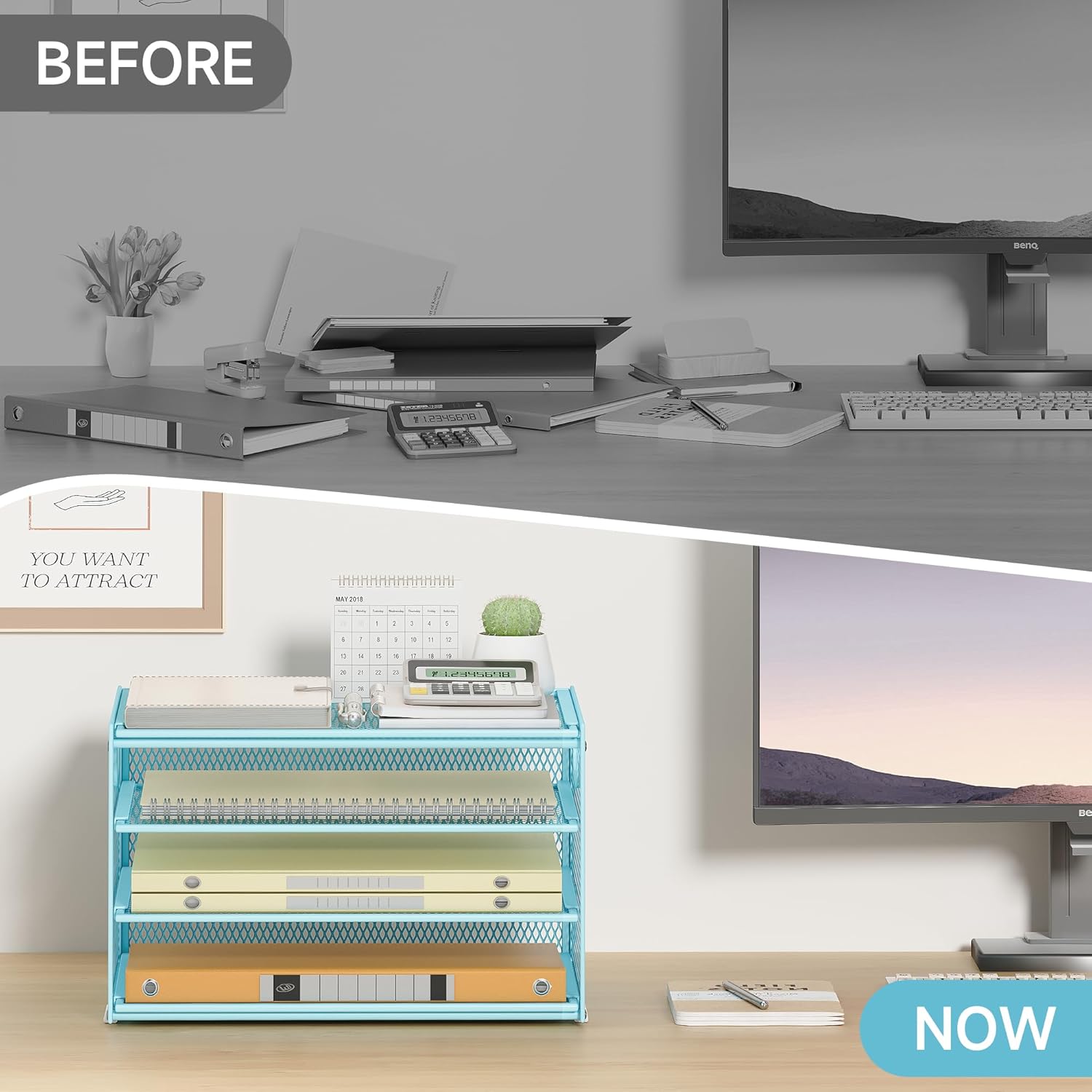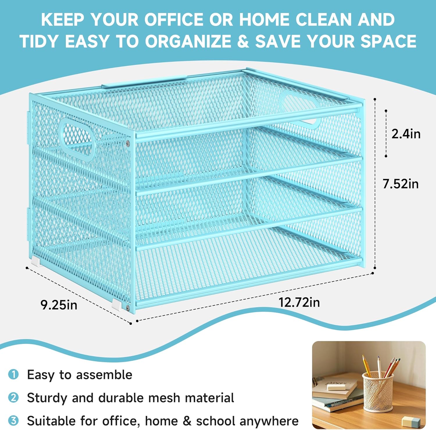 - Paper Organizer Function and Usage: The mesh desktop file organizer can hold various items including paper, folders, books, bills, notebooks, etc. The open design enables quick identification and access to contents, helping to declutter and organize the desk