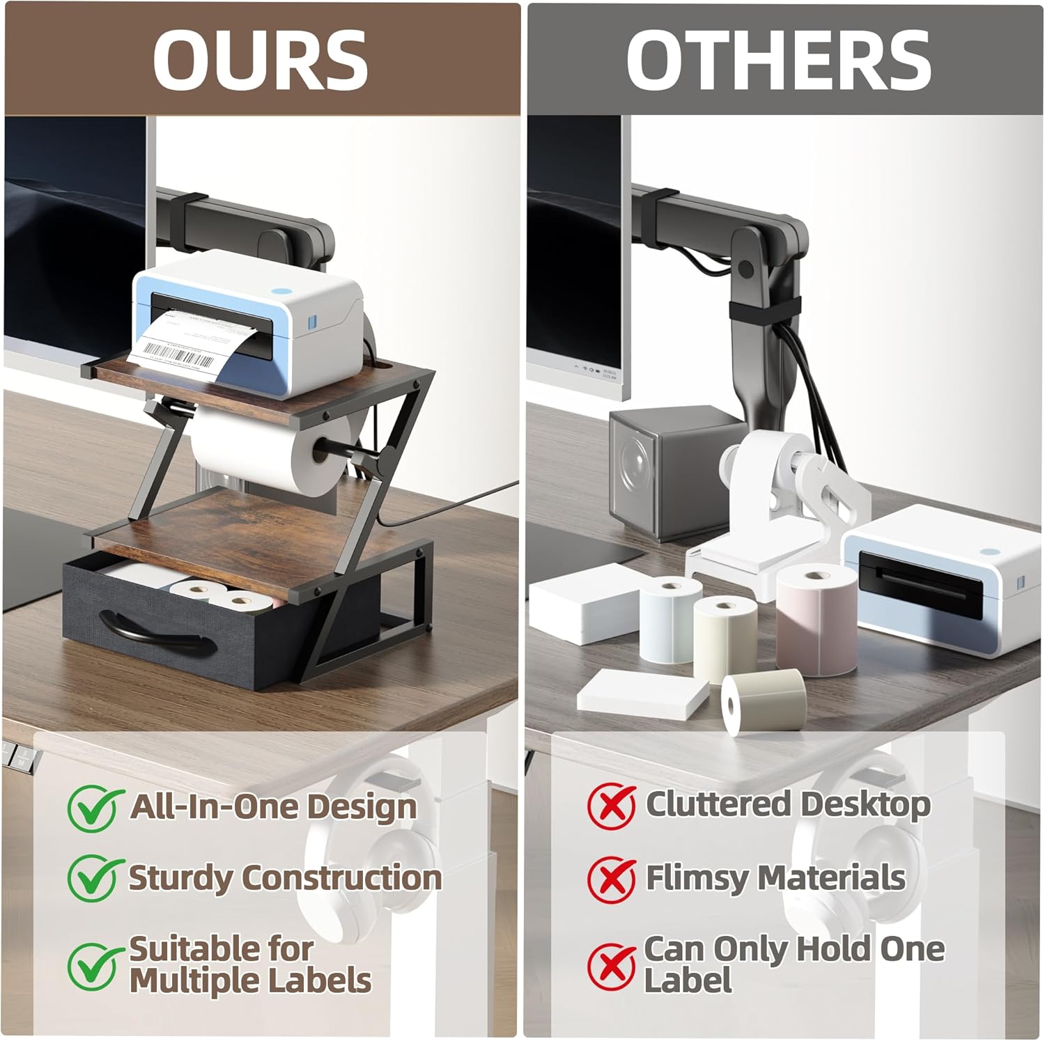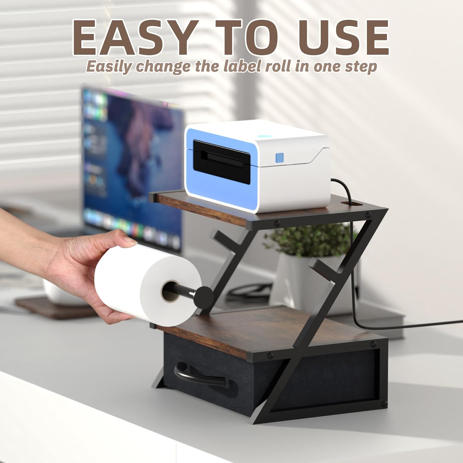 - 【All-in-One Design】: This label roll holder can accommodate both a thermal label printer and a label roll at the same time. There are holes on both sides of the top shelf, which can neatly hide the power cord. The bottom drawer is designed to not only store printed labels, pens, and other small items while keeping out dust, but can also be pulled out separately to use as a desktop organizer