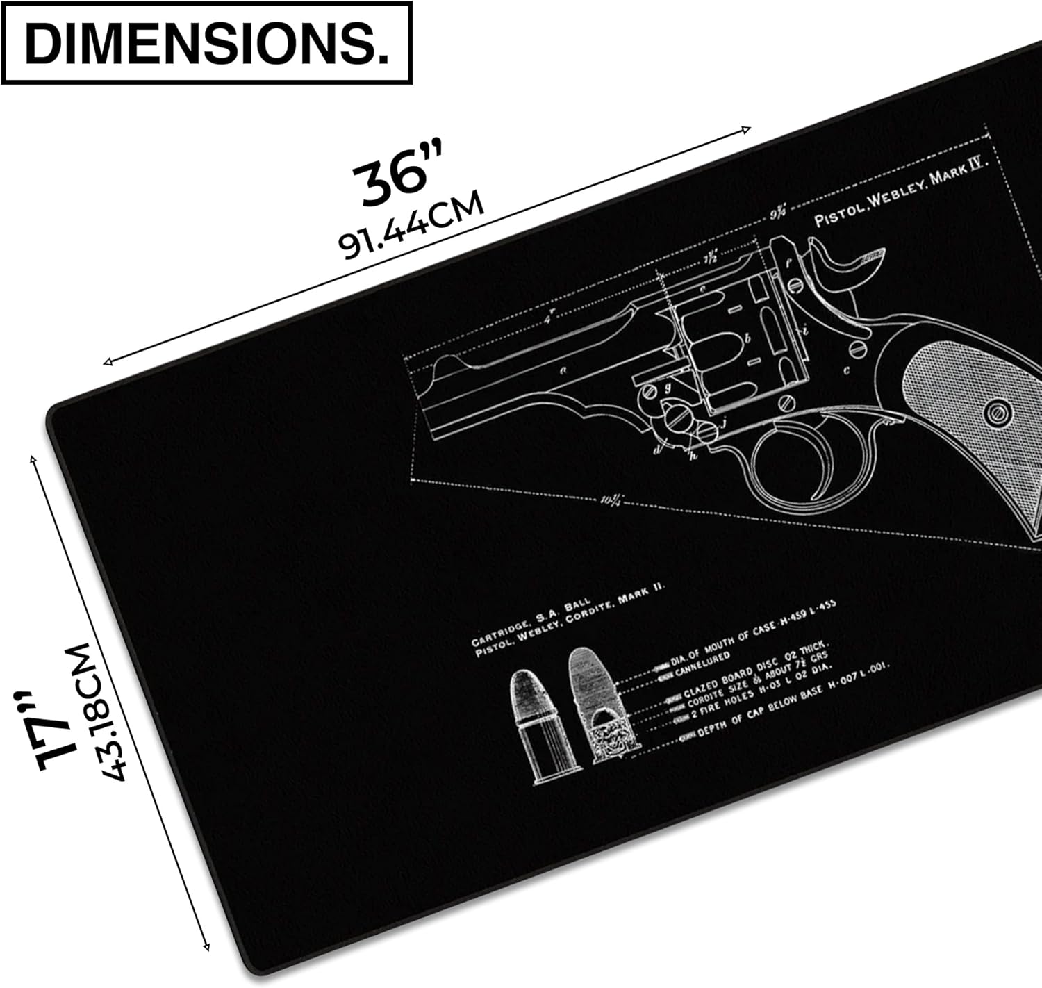 MPCO. Blueprints Large Gaming Desk Pad - 36" x 17" Aeroglyde Fabric Pistol Webly Mark IV – Black Desk Mats - Non-Slip, Washable, Smooth Glide for Precision Gaming & Work