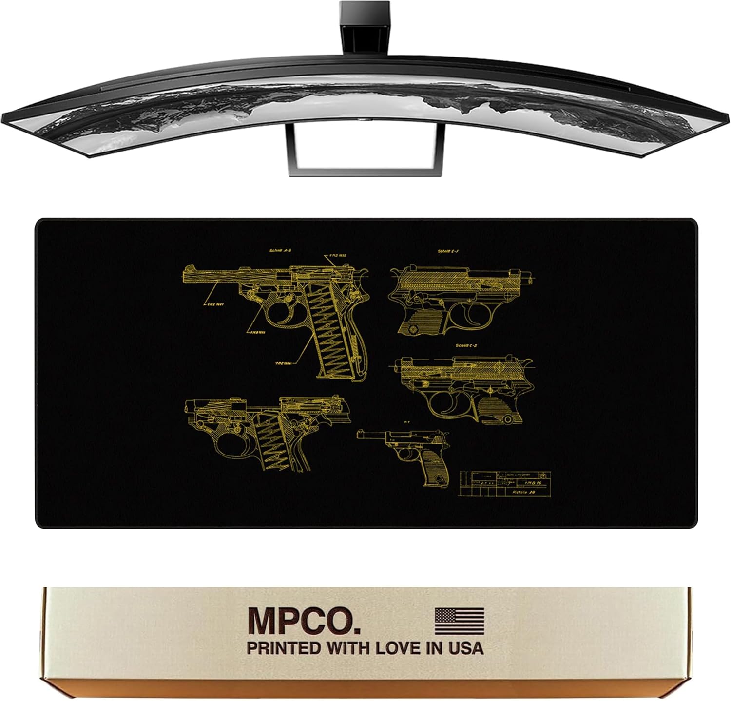 MPCO. Blueprints Large Gaming Desk Pad - 36" x 17" Aeroglyde Fabric Pistol 38 – Black/Yellow Desk Mats - Non-Slip, Washable, Smooth Glide for Precision Gaming & Work