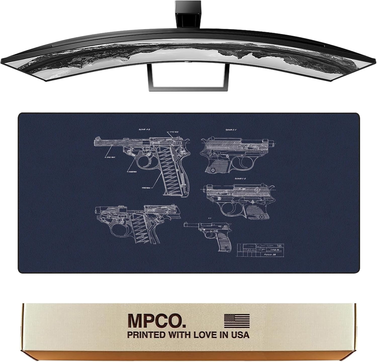MPCO. Blueprints Large Gaming Desk Pad - 36" x 17" Duraglyde Fabric Pistol 38 – Blue Desk Mats - Non-Slip, Washable, Smooth Glide for Precision Gaming & Work