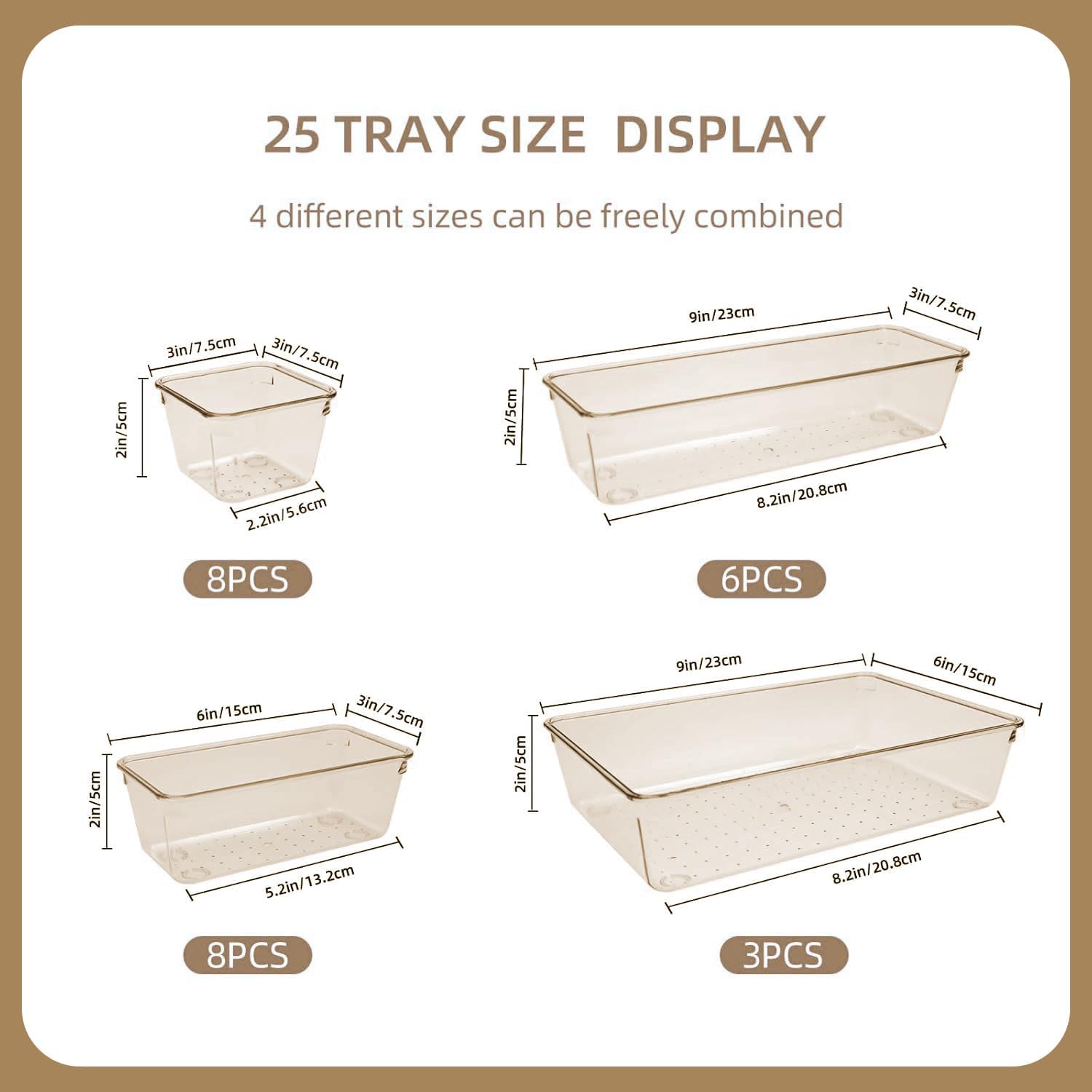 - 【4 SIZE Clear Champagne MAKEUP DRAWER ORGANIZER TRAYS】 Total 25 PCS: 9 x 6 x 2 inches (3 pcs), 9 x 3x 2 inches (6 pcs), 6 x 3 x 2 inches (8 pcs), 3 x 3 x 2 inches (8 pcs), help you customize the combination to store items and organize drawers on shelves.