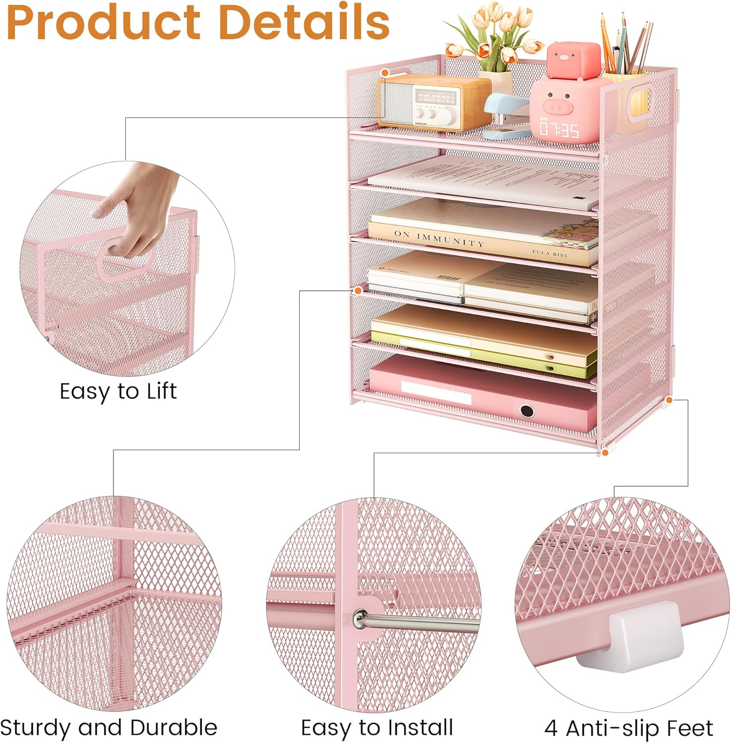 Subekyu 6-Tier Desk Paper Organizer, Desktop File Letter Tray with Handle, Document Sorter and Accessories Holder for Office, Home and School Workspace Organizers, Pink-2 Pack