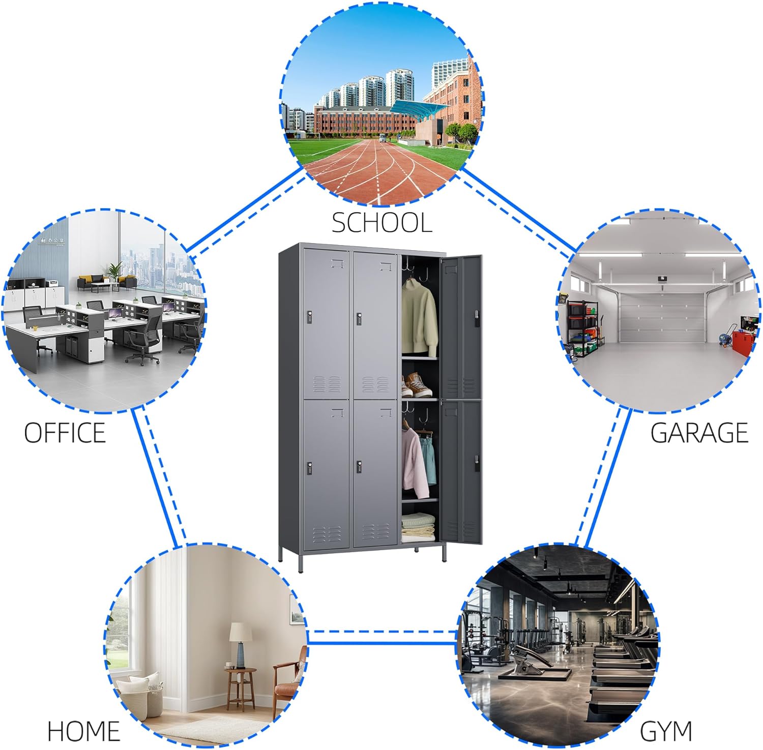 - 【Large Storage Capacity】6 doors metal lockers for employees with Lock 15.75"D x 35.43"W x 72"H. Equipped with 18 hooks,it can meet your needs for storing different sized items and meet most of your daily needs.Each metal locker is equipped with a combination lock, allowing you to use the locker without carrying a key.