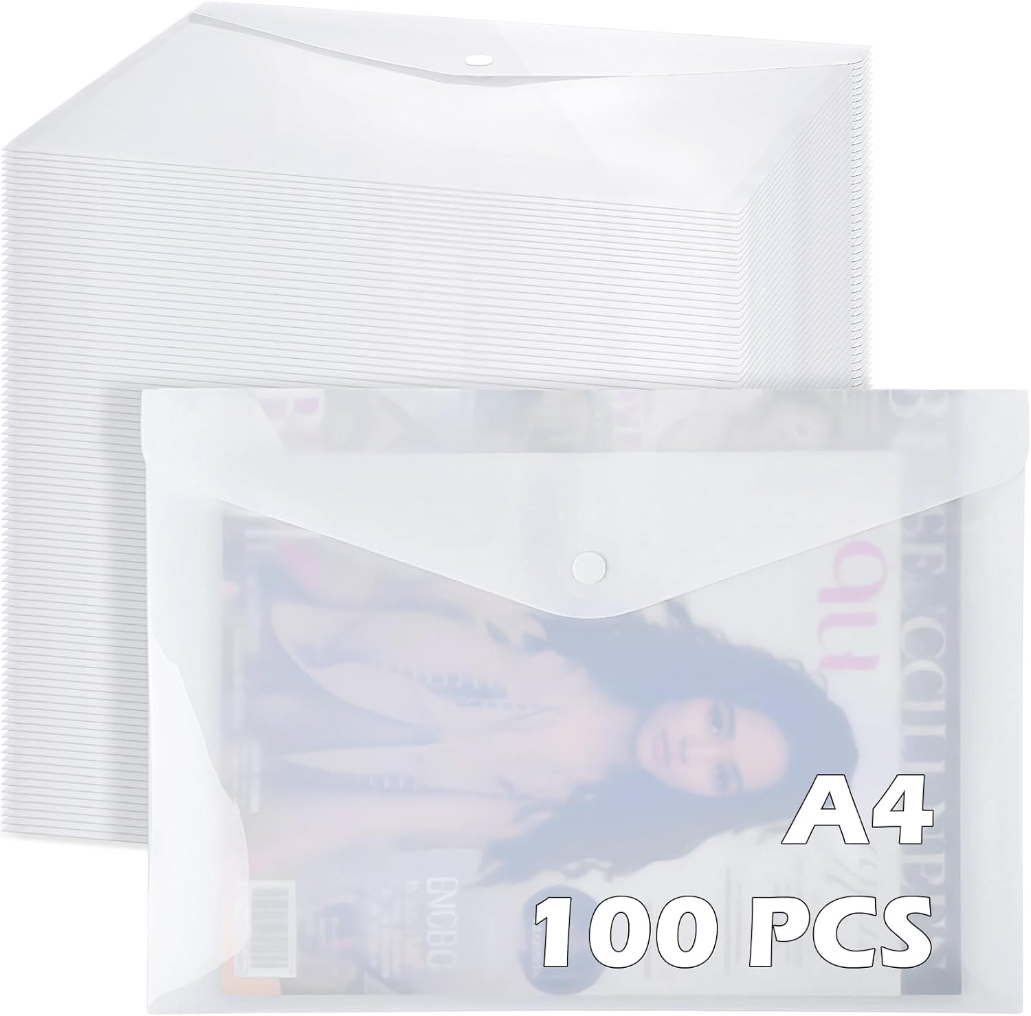100 Pcs Clear Envelopes with Snap Button Closure Bulk A4 Letter Size Clear Plastic Envelope Folder Document Organizer File Folders for Office Home (Milky)