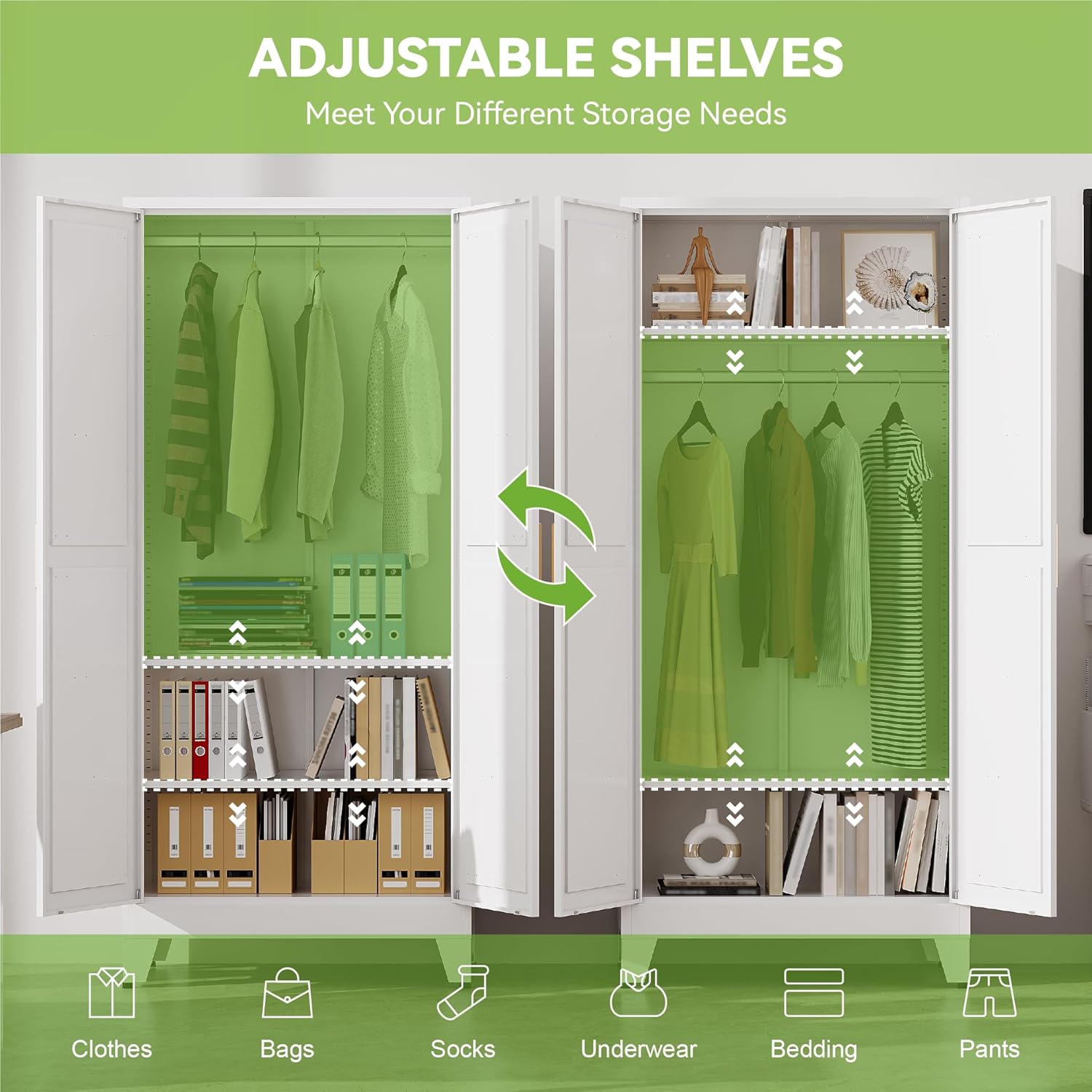 Metal Wardrobe Cabinet with Hanging Rod,Large 71" Armoire Wardrobe Closet with Adjustable Shelves,Farmhouse Metal Clothing Storage Cabinets for Bedroom,Office,Laundry Room(White)