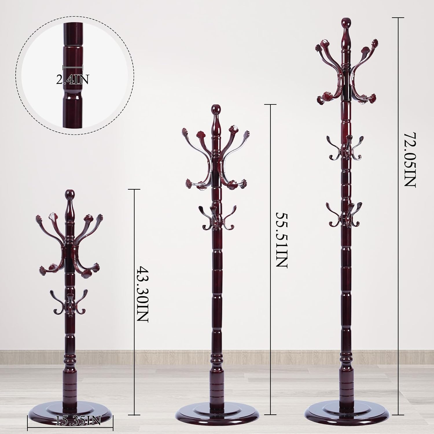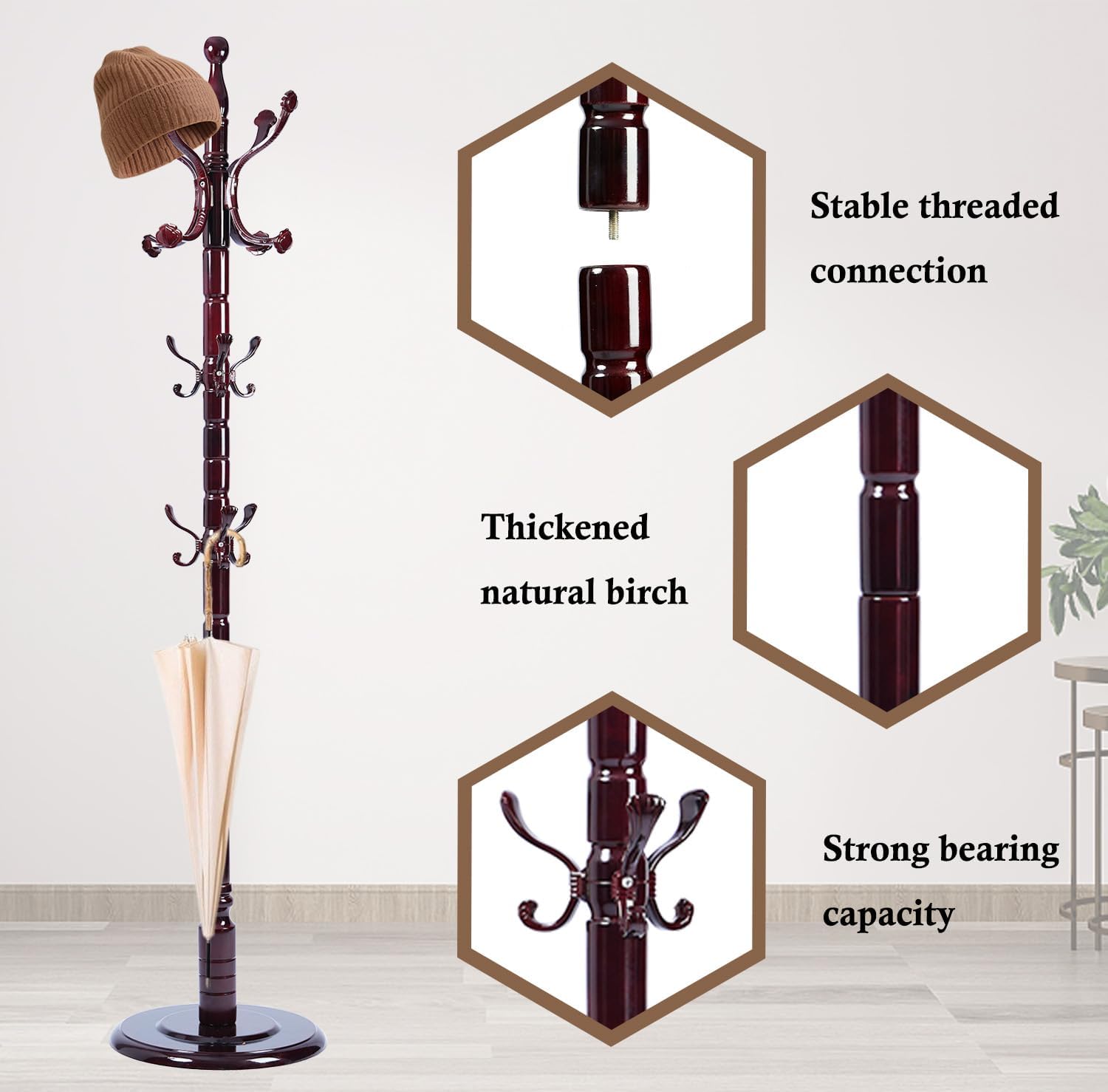 - 【Wider Application】The wooden coat tree is designed in a vintage style, with a simple structure and comprehensive functions. The coat rack can be placed in the hallway, living room, bedroom, office, and any corner you need. The wooden coat tree stand adopts an embedded screw design and is connected to the main pole, and the full-tooth screw is connected to the chassis. Equipped with installation tools and instructions, you can easily complete the installation.
