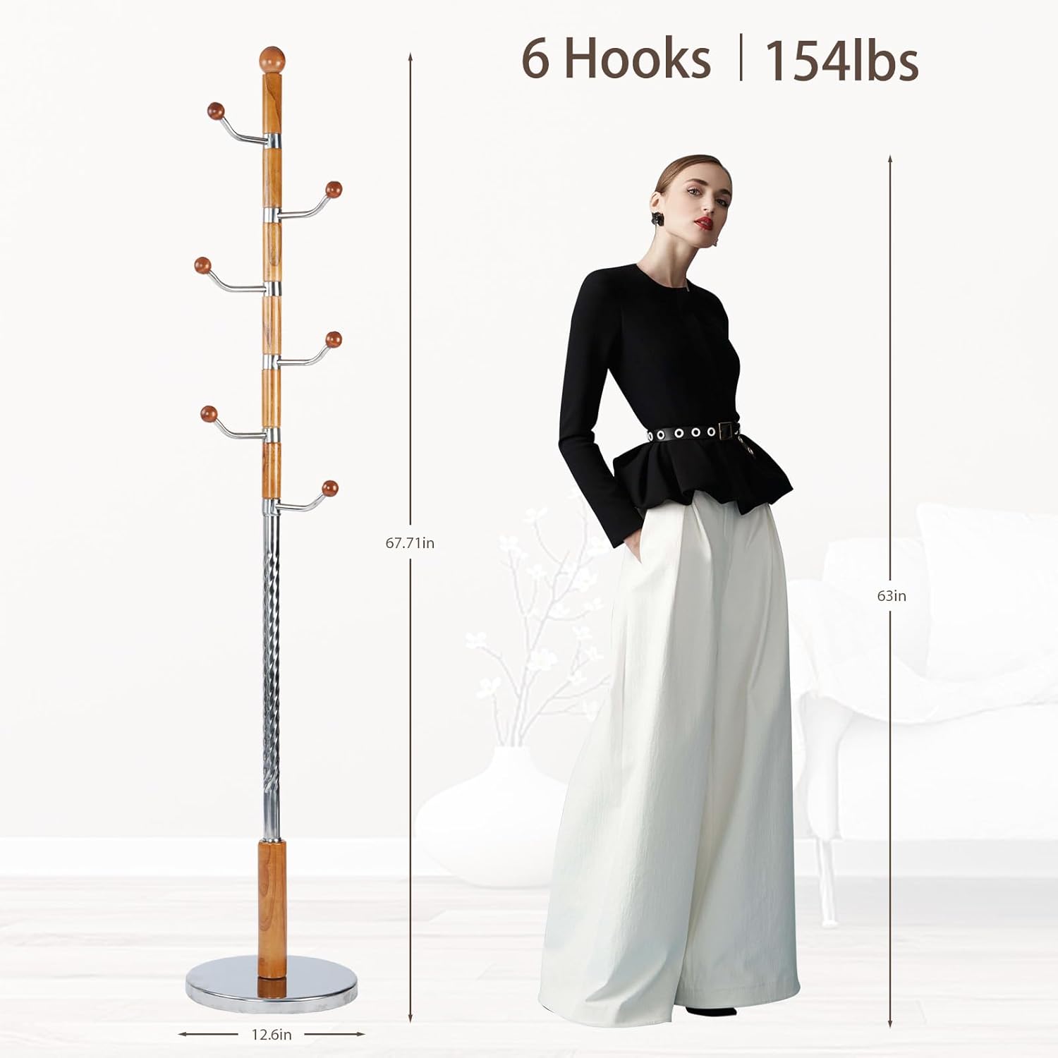 - 【Coat Rack Free Standing】This freestanding coat rack blends polished stainless steel and natural birch wood for durable, modern style. Its sturdy, wear-resistant construction holds coats, bags, hats, and accessories. Perfect by the door, bed, or living room.