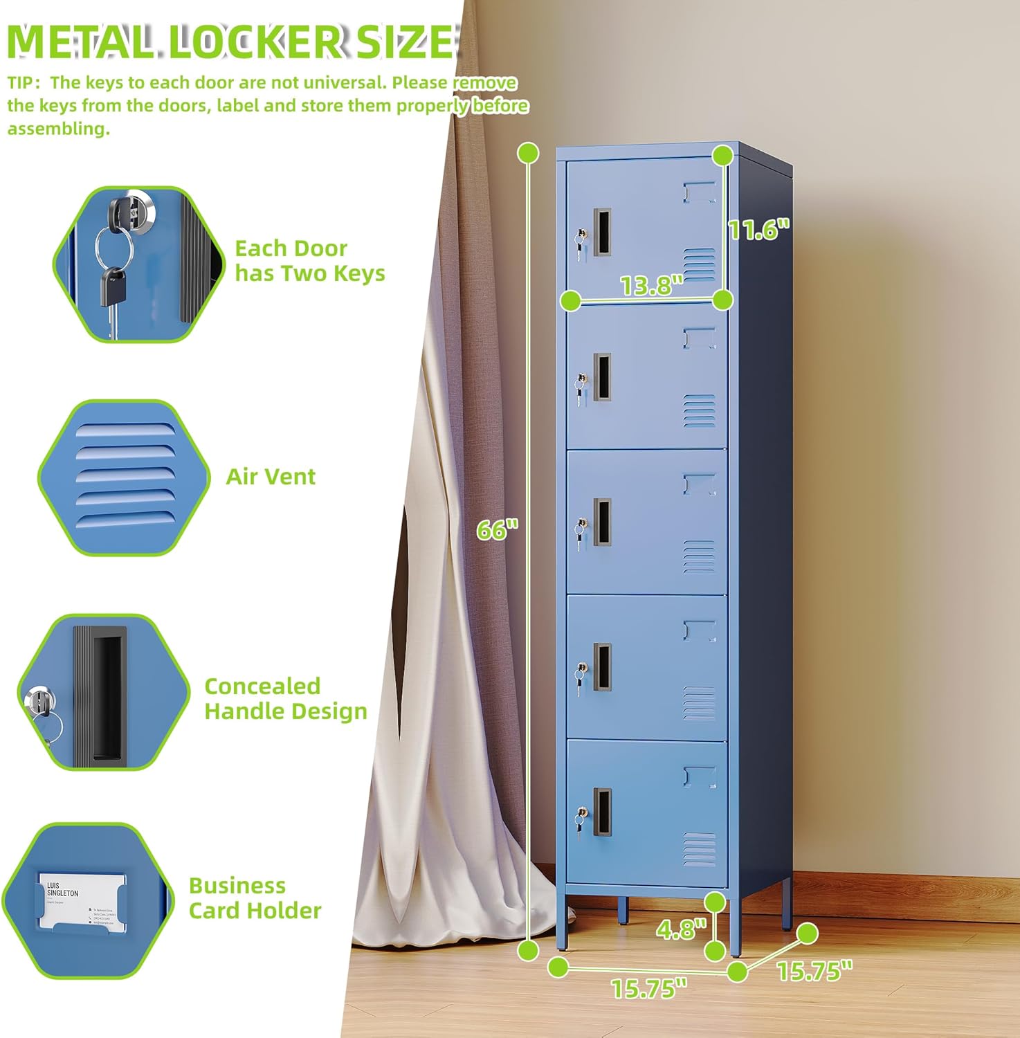 Aobabo 16" W 5 Door Metal Storage Locker with Lock, 66" H Steel Locker with Name Card Holder and Metal Leg for School, Home, Office, Playroom, Assembly Required, Blue