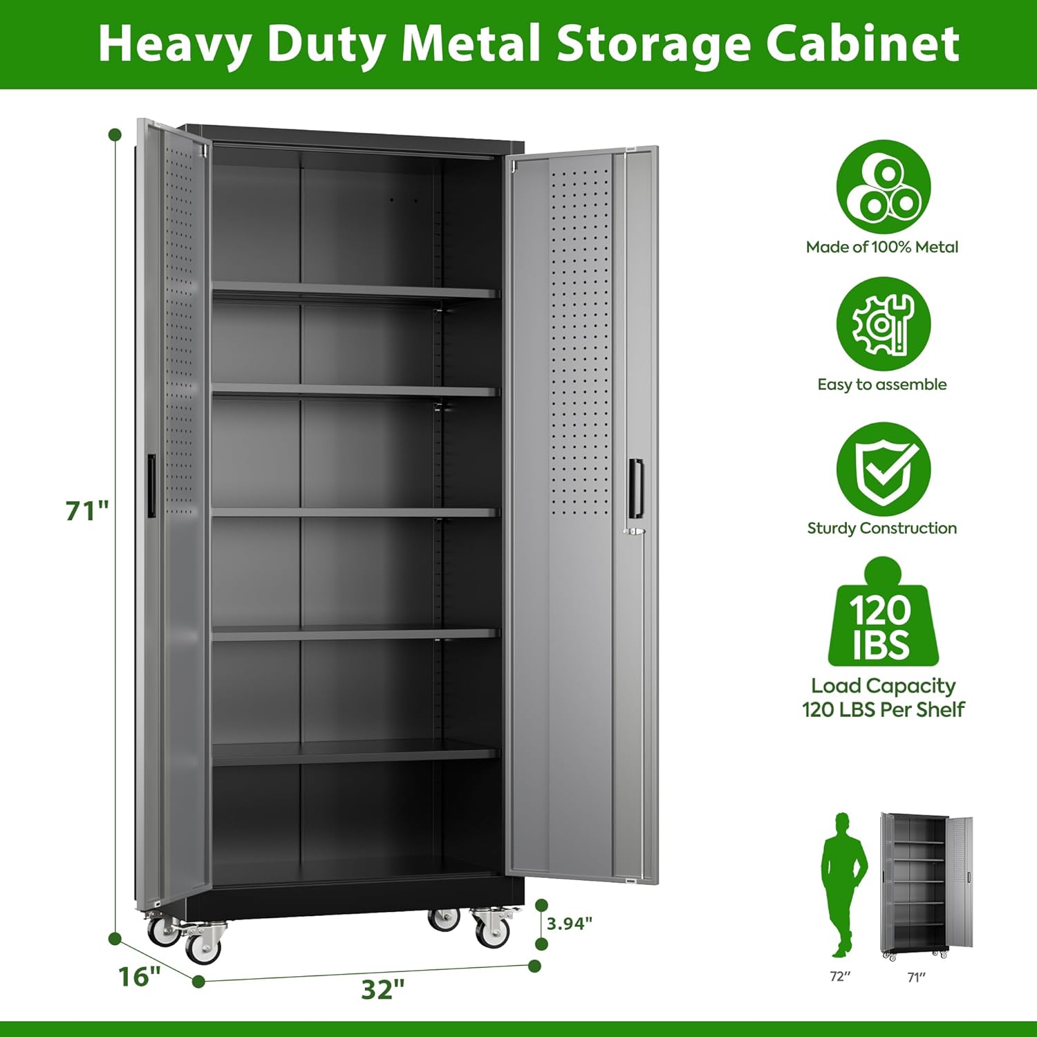 Aobabo Upgraded Garage Storage Cabinets with Wheels,Metal Storage Cabinets with 5 Adjustable Shelves for Garage Home Office Storage, Black&Dark Grey,71''H*32''W*16''D,Assembly Required