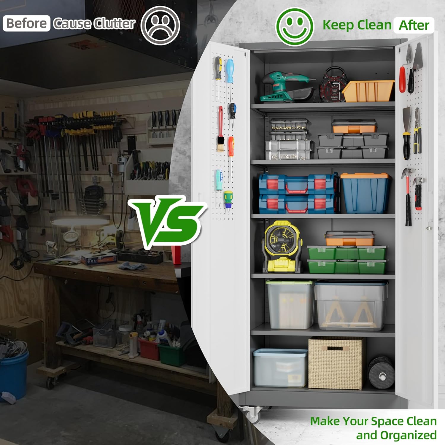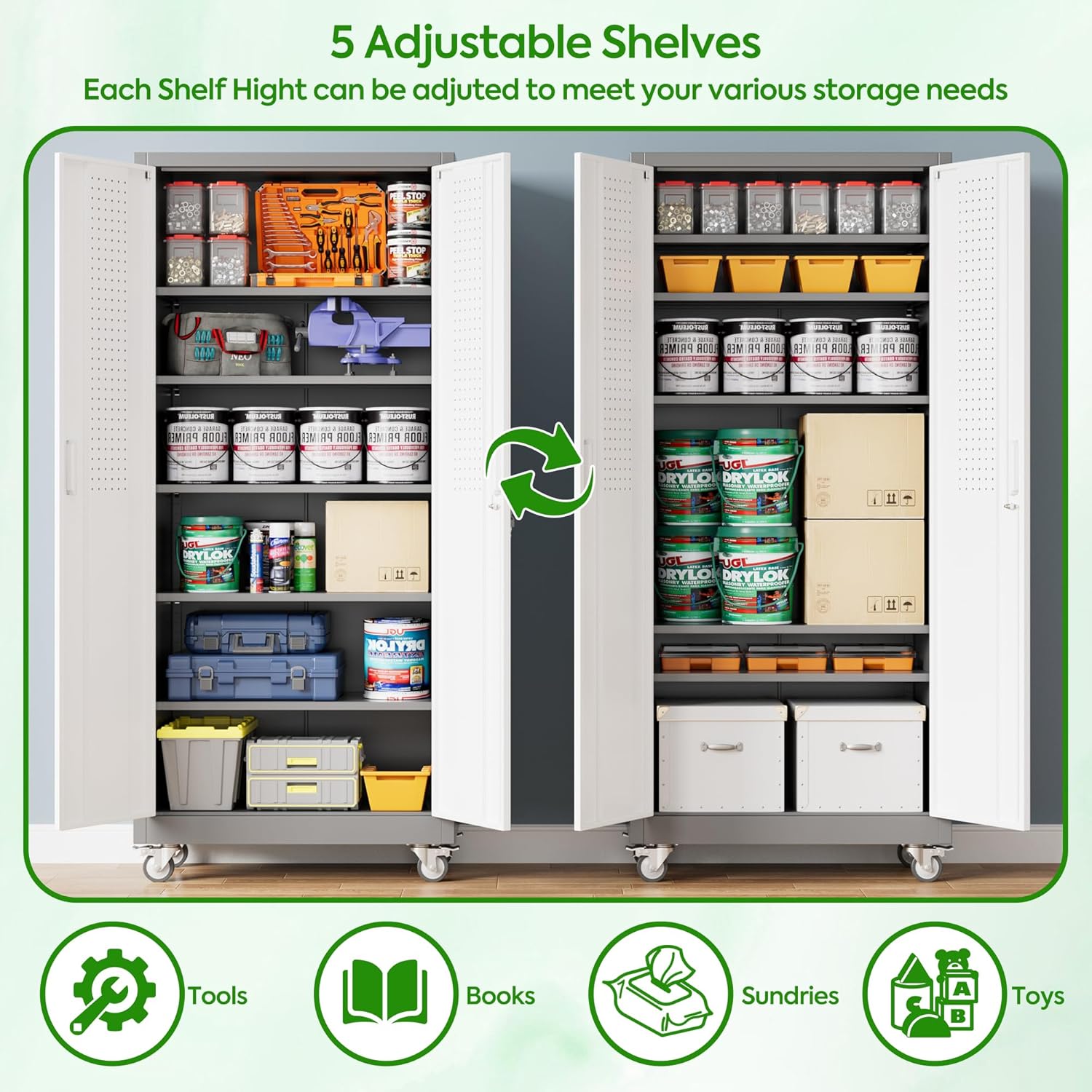 Aobabo Upgraded Garage Storage Cabinets with Wheels,Metal Storage Cabinets with 5 Adjustable Shelves for Garage Home Office Storage, Grey&White,71''H*32''W*16''D,Assembly Required